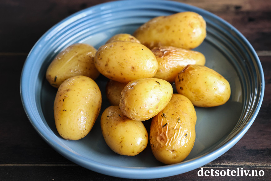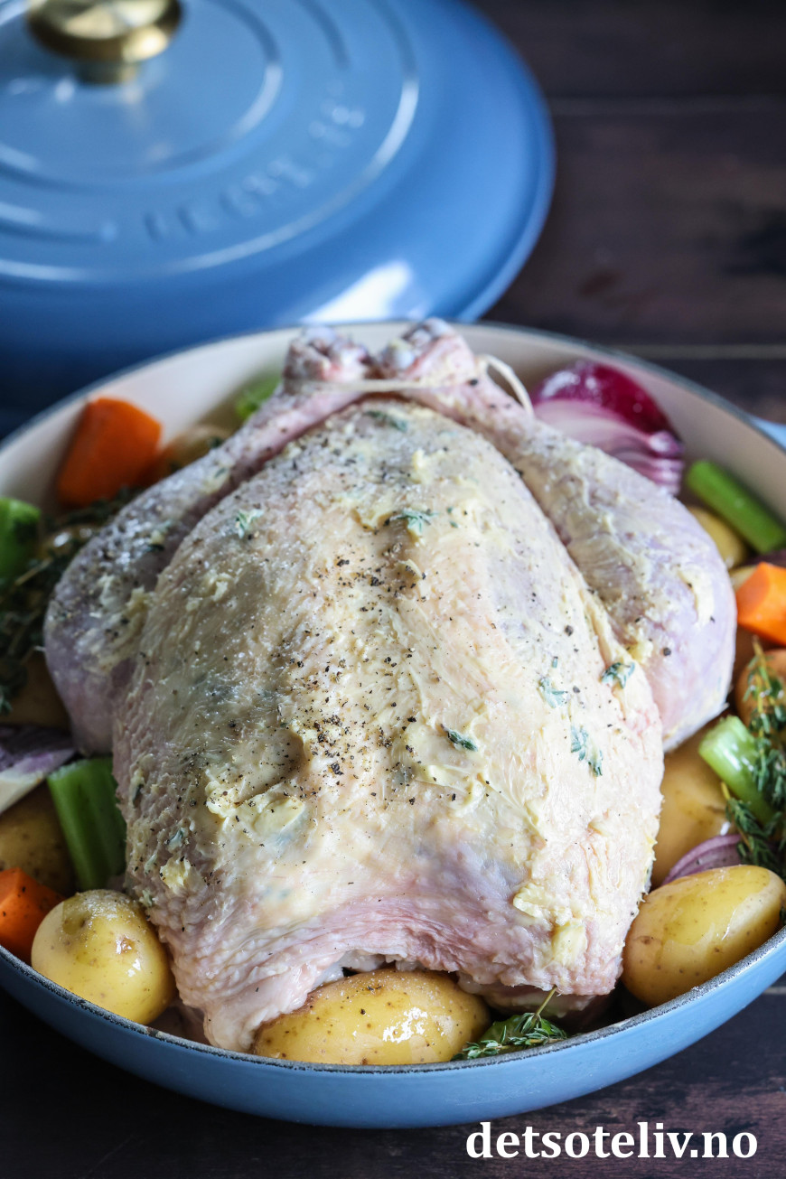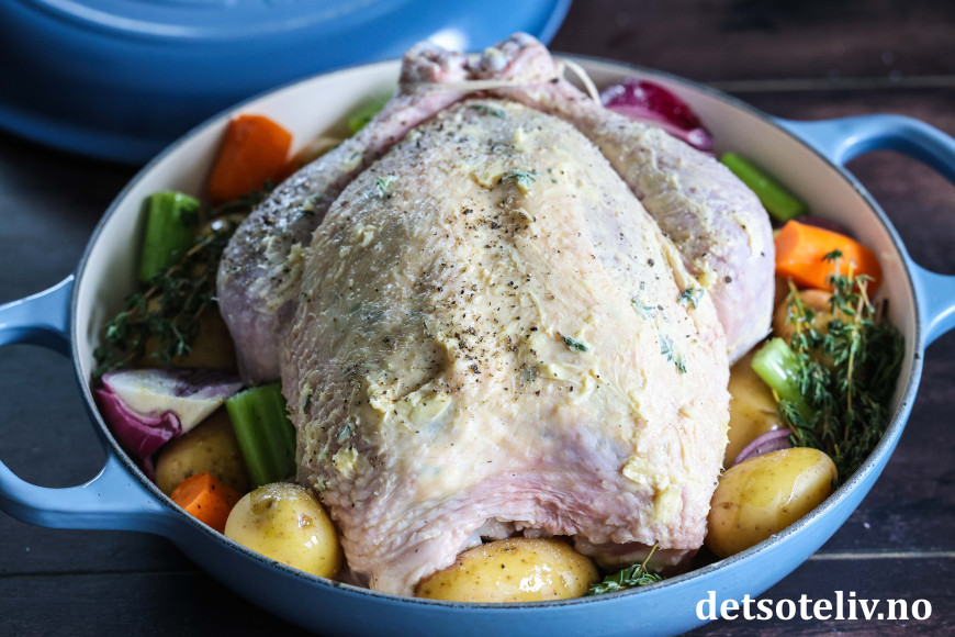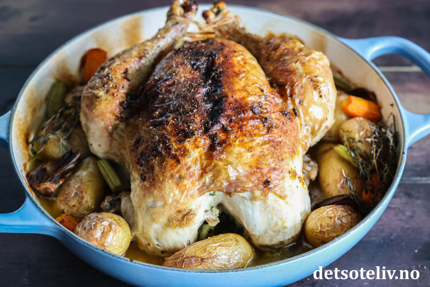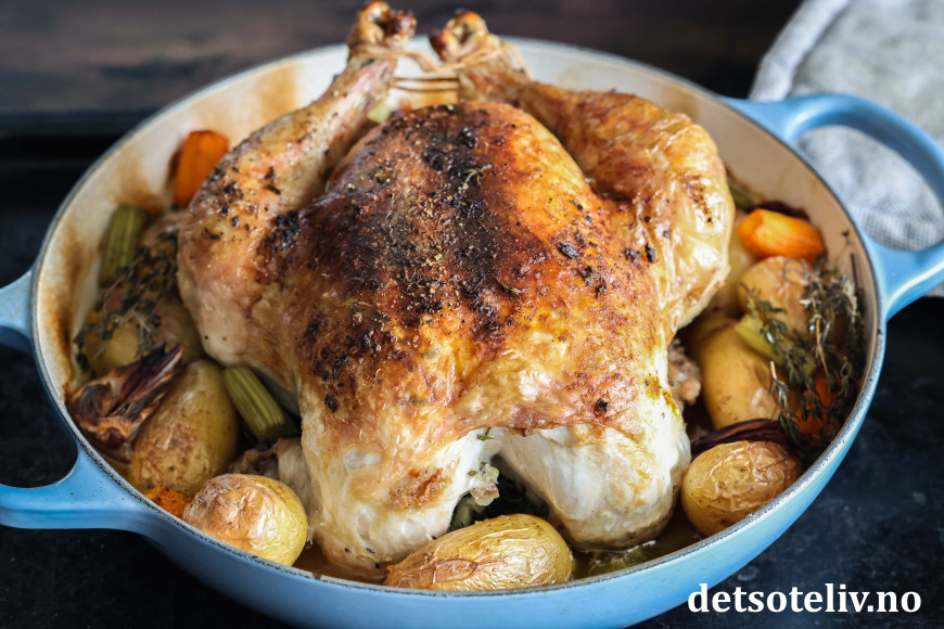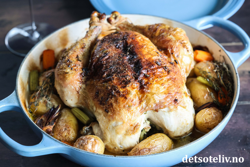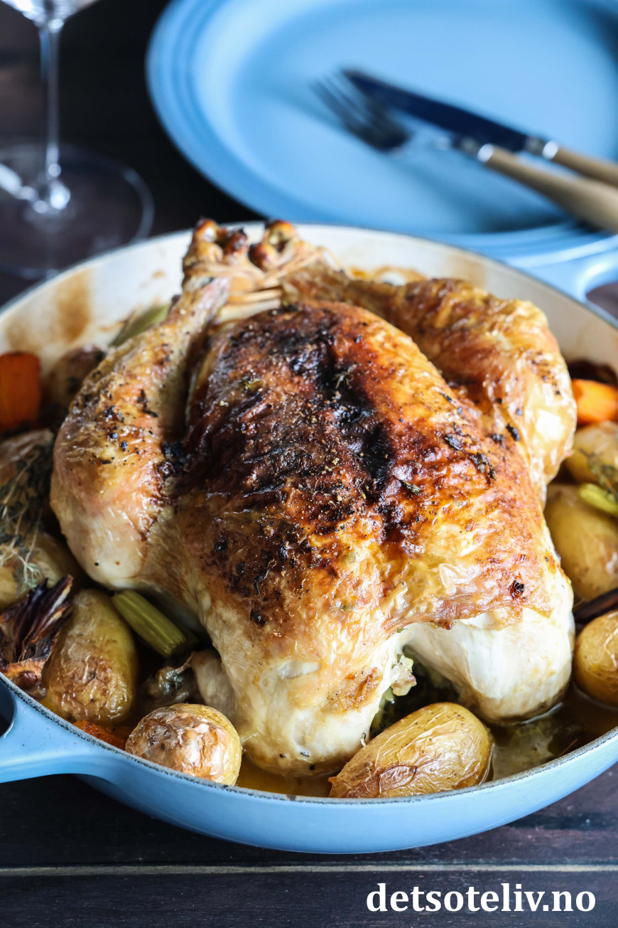 ♥ Jeg har her brukt en nokså stor kylling på ca. 2 kg. Det gjør ikke noe om kyllingen er litt større eller mindre. Tilpass størrelsen på formen til størrelsen på kyllingen og mengden grønnsaker du vil servere til. Jeg brukte her en kylling på 2 kg og nokså små poteter, og da passet det fint å bruke en buffetgryte fra Le Creuset som form (stek kyllingen uten lokket på). Alternativt kan du bruke en vanlig langpanne.