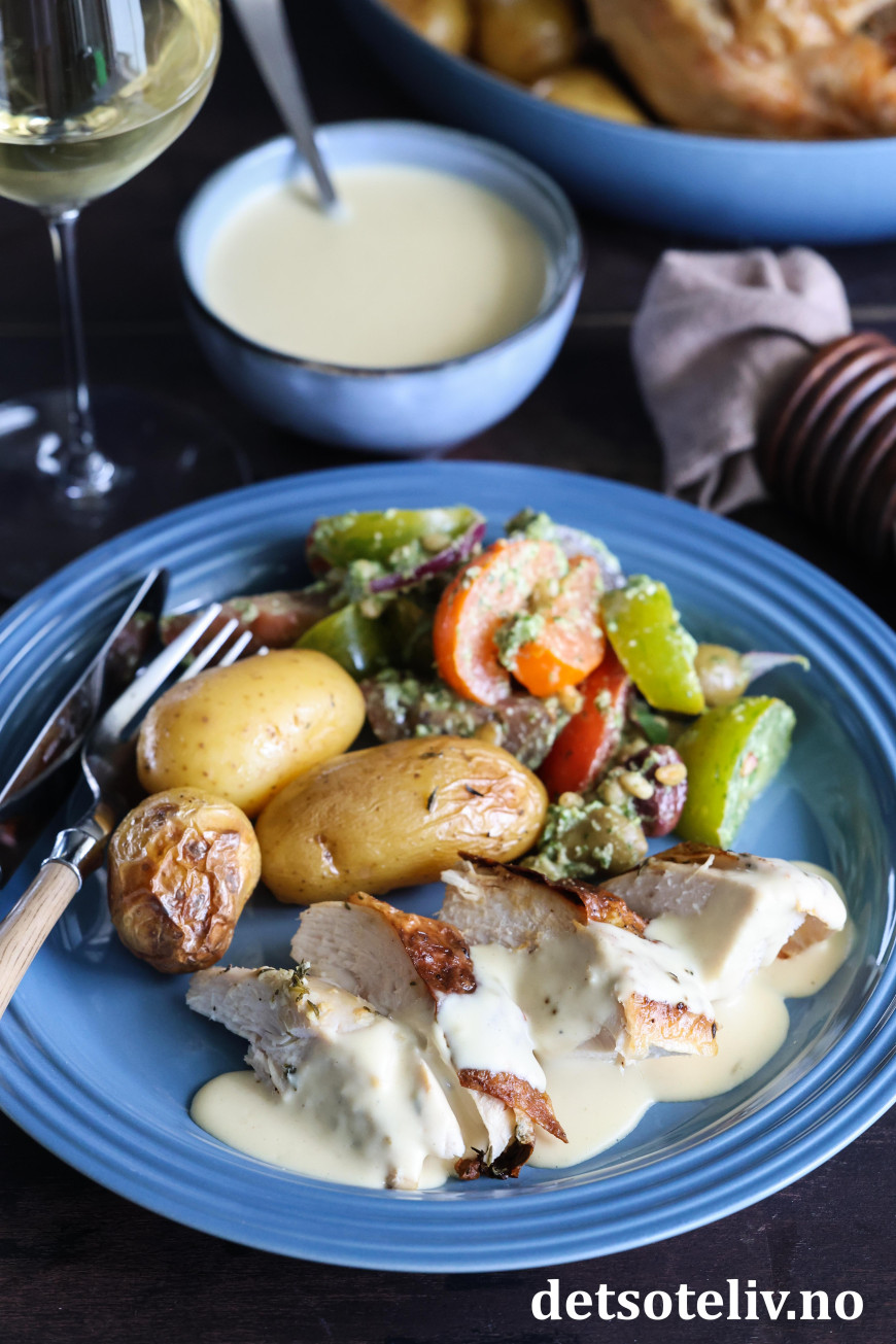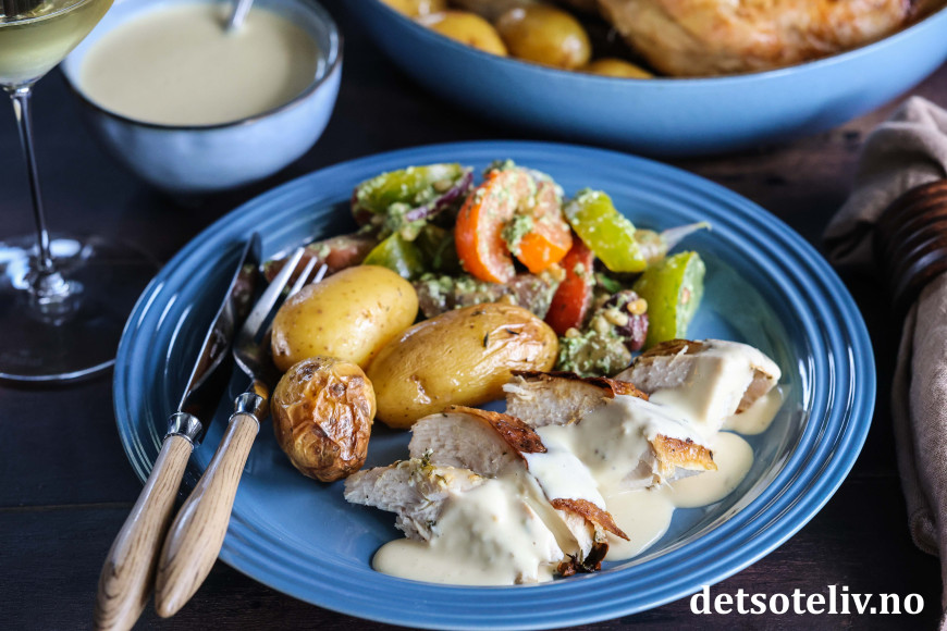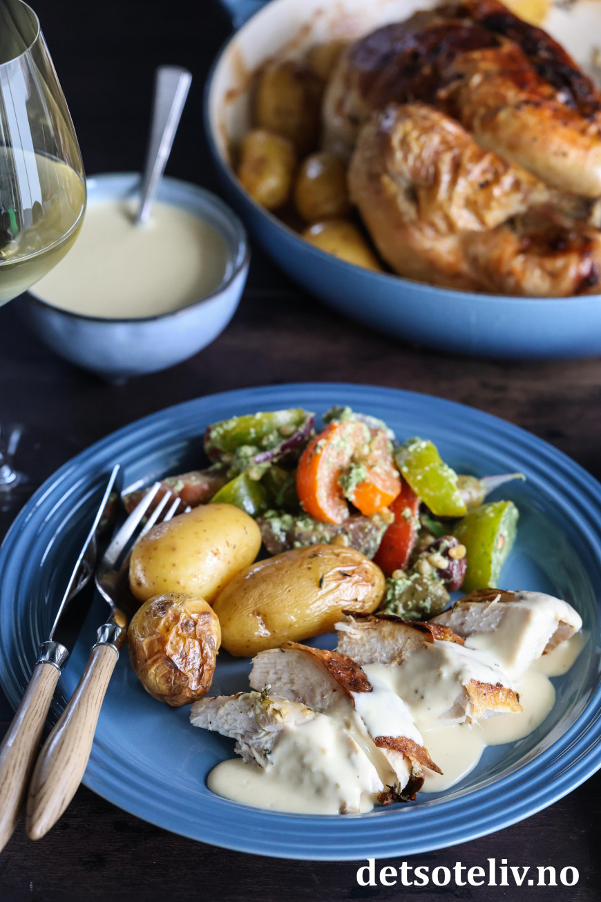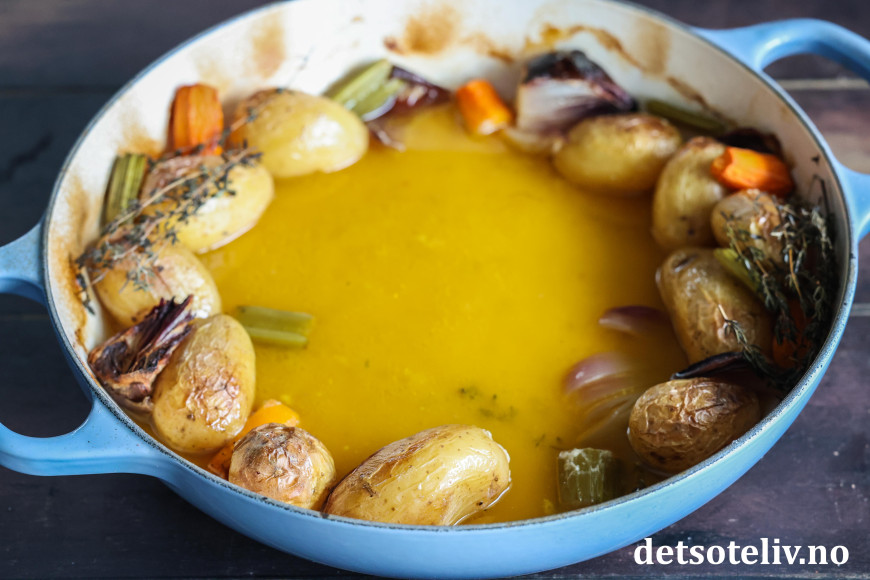 ♥ Jeg synes potetene blir veldig gode av å steke lenge i kyllingkraften. Grønnsakene i kraften synes jeg ofte kan bli litt for tørre, så jeg pleier å dampe eller ovnsbake grønnsaker i tillegg i en egen form de siste 45 minuttene av steketiden. Grønnsakene som steker sammen kyllingen gir imidlertid god smak på kraften som du bruker i kyllingsausen, så ikke dropp å ta dem med.