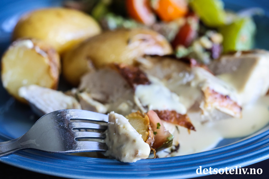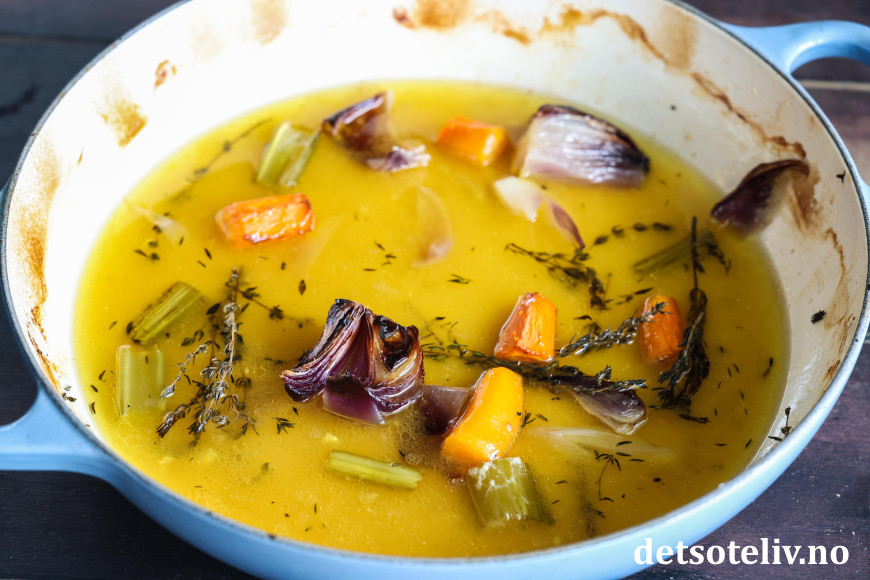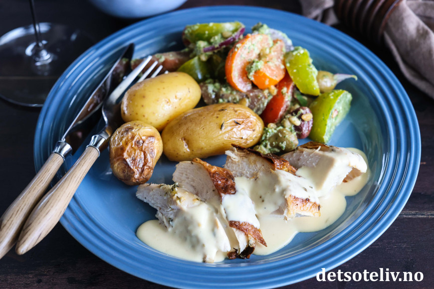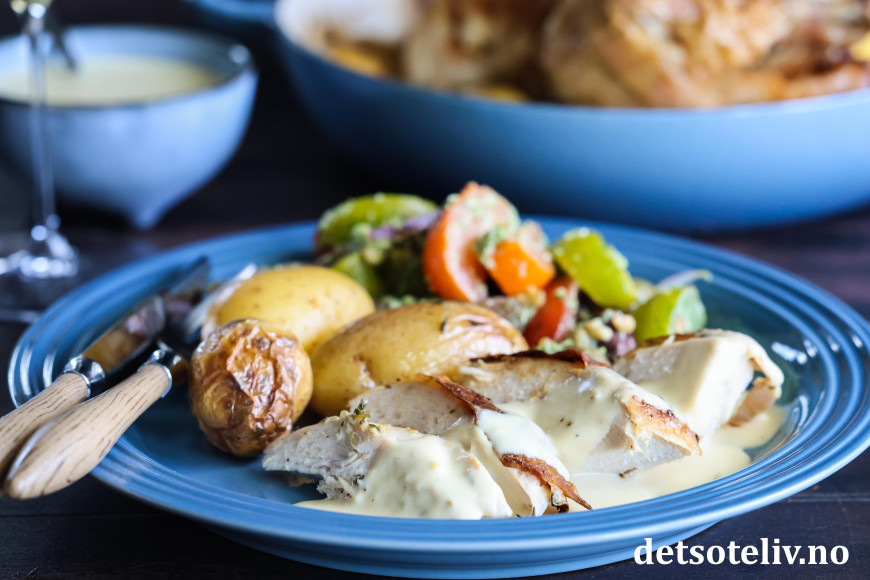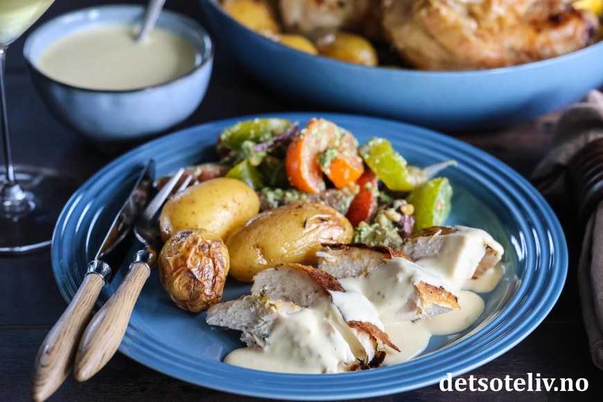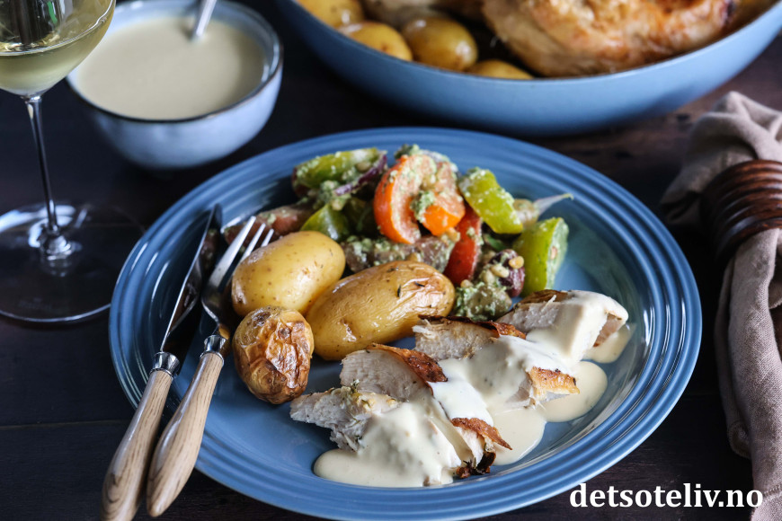 ♥ Jeg synes potetene blir veldig gode av å steke lenge i kyllingkraften. Grønnsakene i kraften synes jeg ofte kan bli litt for tørre, så jeg pleier å dampe eller ovnsbake grønnsaker i tillegg i en egen form de siste 45 minuttene av steketiden. Grønnsakene som steker sammen kyllingen gir imidlertid god smak på kraften som du bruker i kyllingsausen, så ikke dropp å ta dem med.