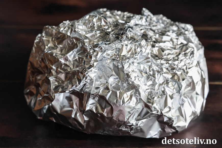 La den stekte kyllingen hvile i 15 - 20 minutter før du skjærer i den. Jeg liker å pakke kyllingen inn i aluminiumsfolie slik at den ikke tørker ut.
