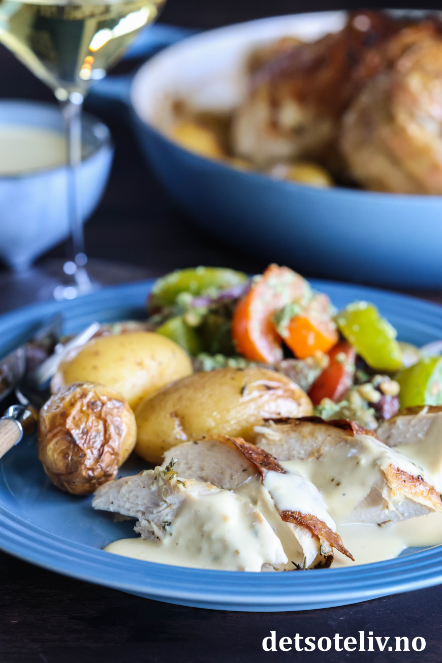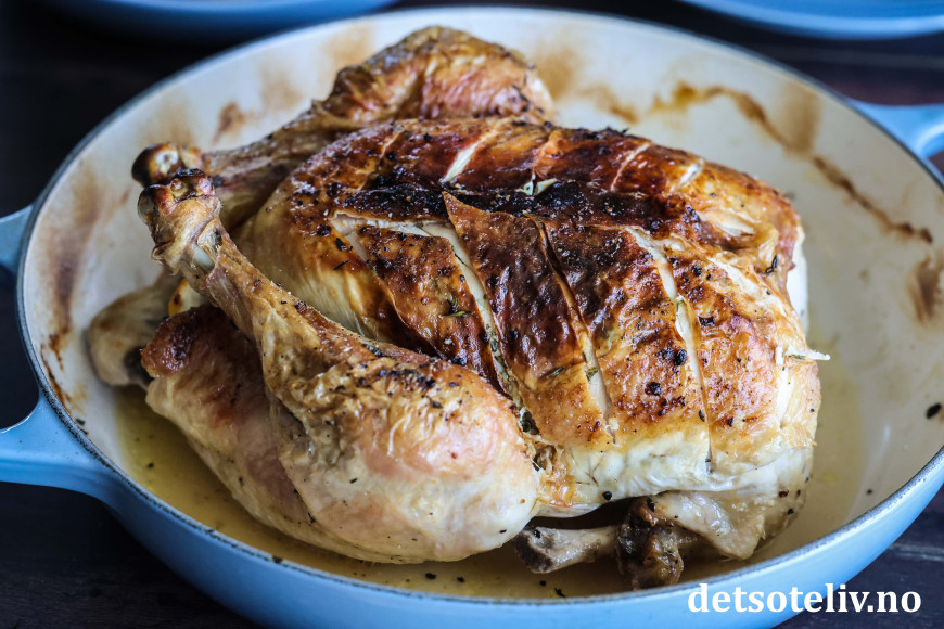I tillegg til å se flott ut, er dette et måltid som metter mange, så helstekt kylling er ypperlig mat å servere til gjester!