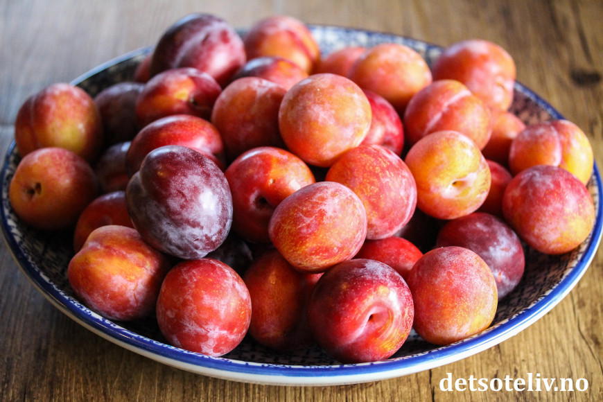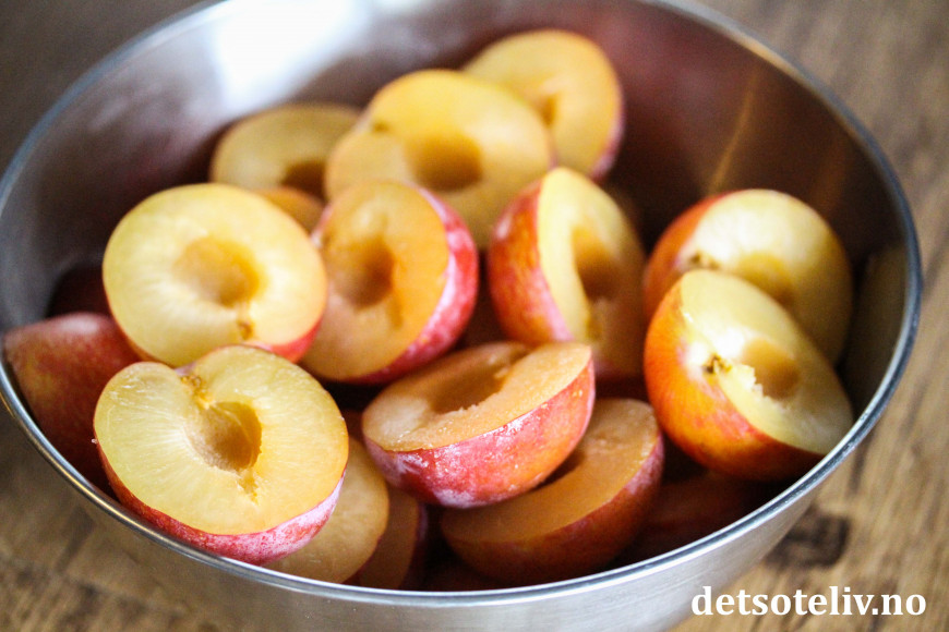 Hvis du vil kan du dele plommene på midten og fjerne stenene (se tips).