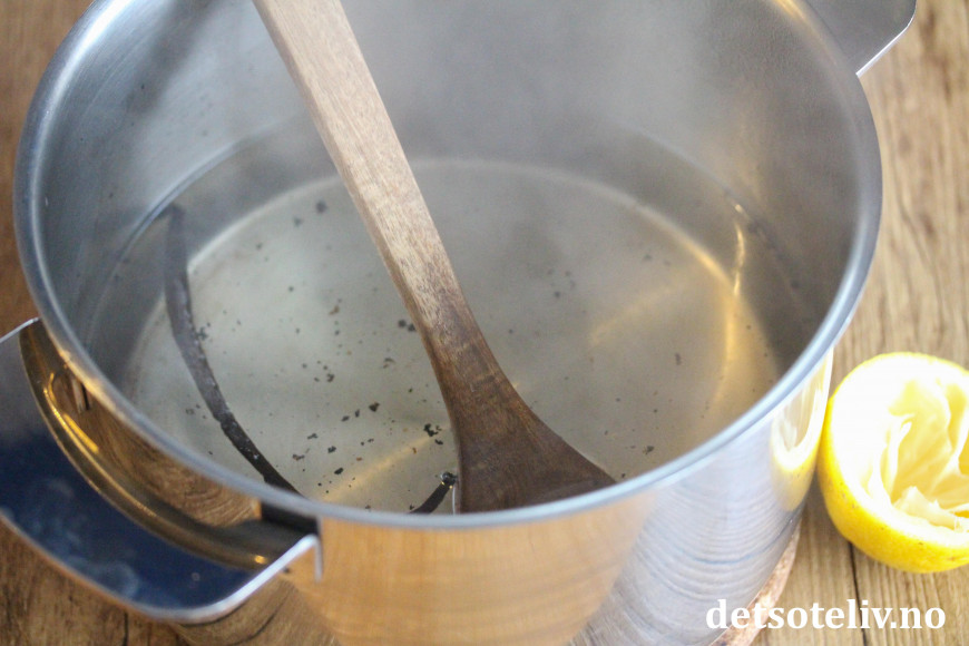 Ha vann, sukker, presset saft fra sitron og vaniljestenger (snitt opp og skrap ut frøene) i en nokså stor kjele (du skal ha plass til plommene). Hvis du vil, kan du også ha kanelstenger i kjelen.