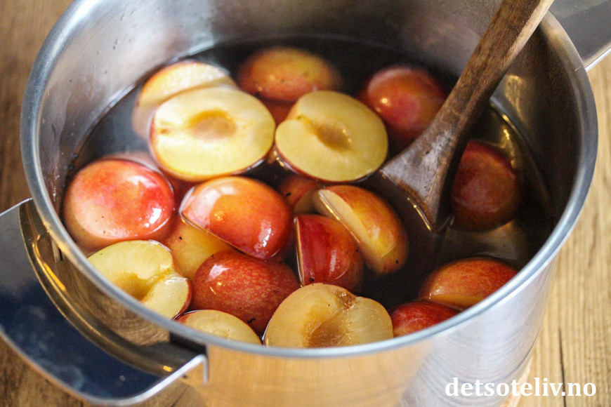♥ Det er heller ikke nødvendig å flå plommene, men du kan gjøre det hvis du vil. Legg plommene i så fall i en kjele med kokende vann i ca 1 minutt. Ha dem deretter i en kjele med iskaldt vann. Du vil da se at det ytre skinnet løsner og kan dras av plommene.