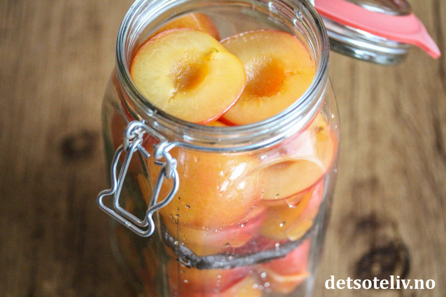 ♥ Vaniljestenger i sukkerlaken gir deilig smak på plommene. Du kan i tillegg bruke kanelstang hvis du liker det. Jeg brukte ikke kanelstenger, men hadde 2,5 dl konjakk i det ene glasset. Plommene blir da en voksendessert, som ikke kan serveres til barn.