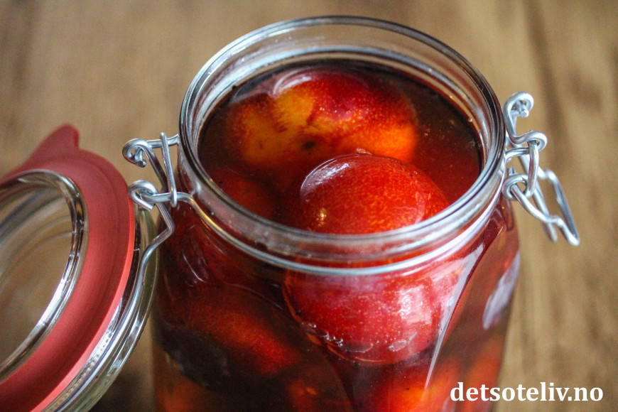 Jeg lagde også en versjon med røde plommer som jeg la hele i glasskrukken uten å fjerne stenene.