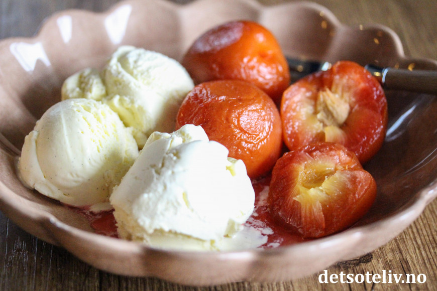 Server plommene med vaniljeis, vaniljesaus eller pisket krem.