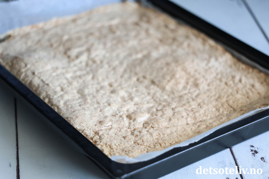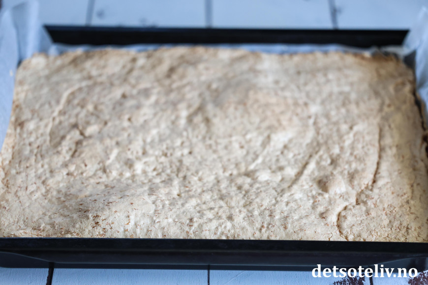 Fordel deigen utover i en stor bakepapirkledd langpanne (ca. 30 x 40 cm).