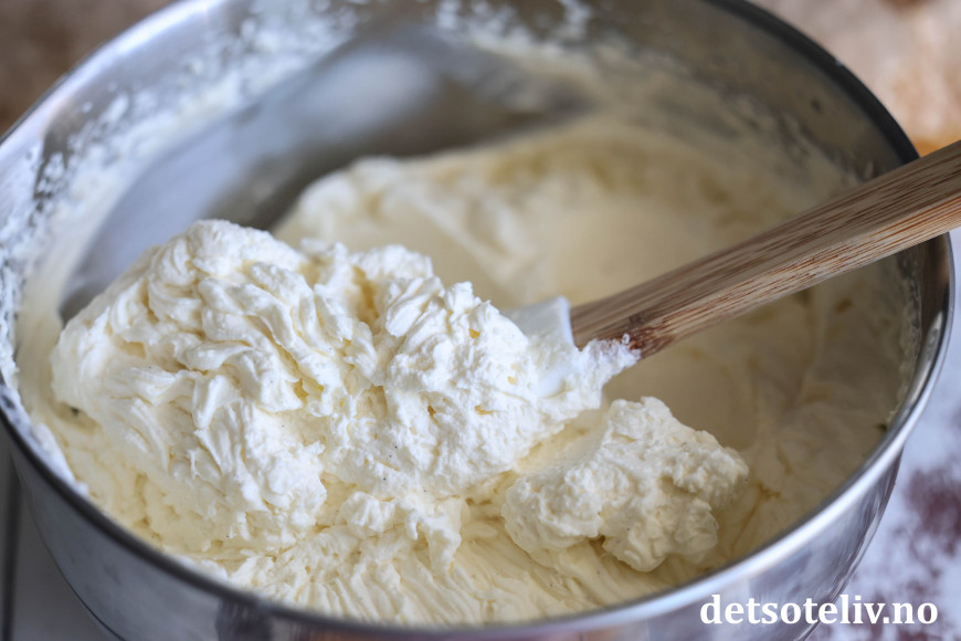 Ha kremfløte, mascarpone, melis og vaniljepasta i en bolle og pisk til du får en tykk krem.