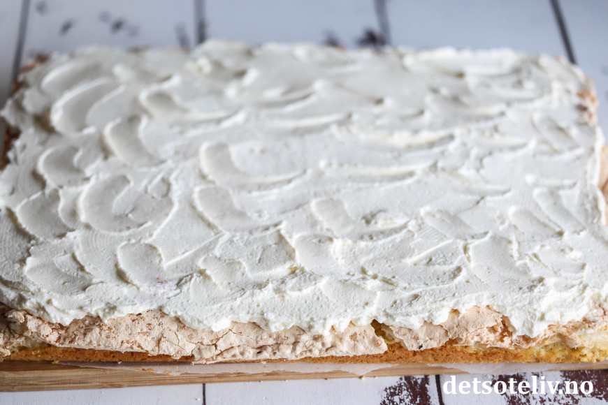 Bre kokosmarengsen over kakedeigen i langpannen. Stek kaken nederst i ovnen ved 170°C i ca. 45 minutter, til kaken er gjennomstekt. La kaken avkjøles i formen til den er helt kald. Løft kaken deretter ut av langpannen og over på et stort fat eller brett.