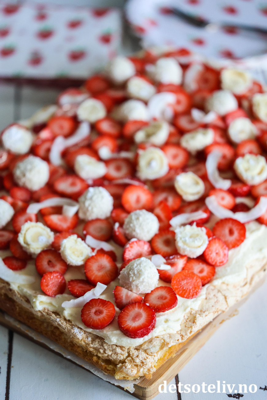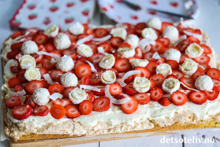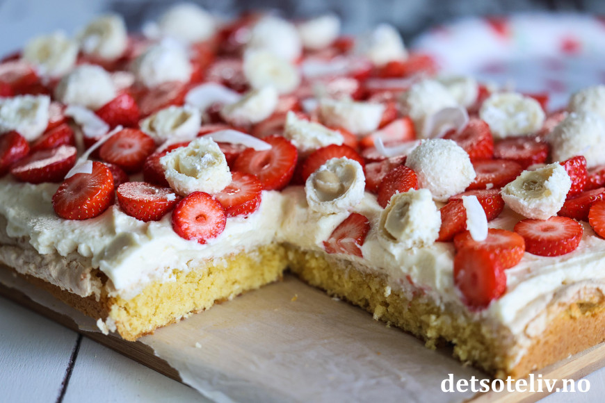Kaken toppes med deilig mascarponekrem og masse friske jordbær. Noen kokosflak og Raffaello-kuler gjør kaken ekstra lekker!