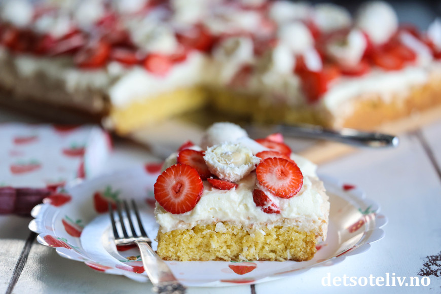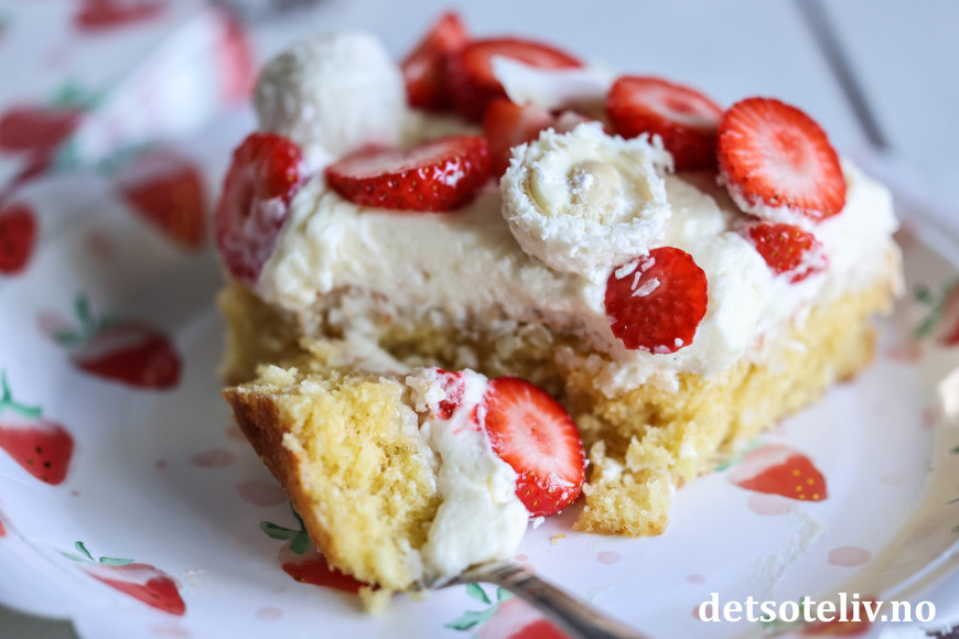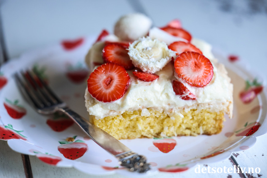 Kaken har nydelig smak av vanilje, kokos og jordbær!