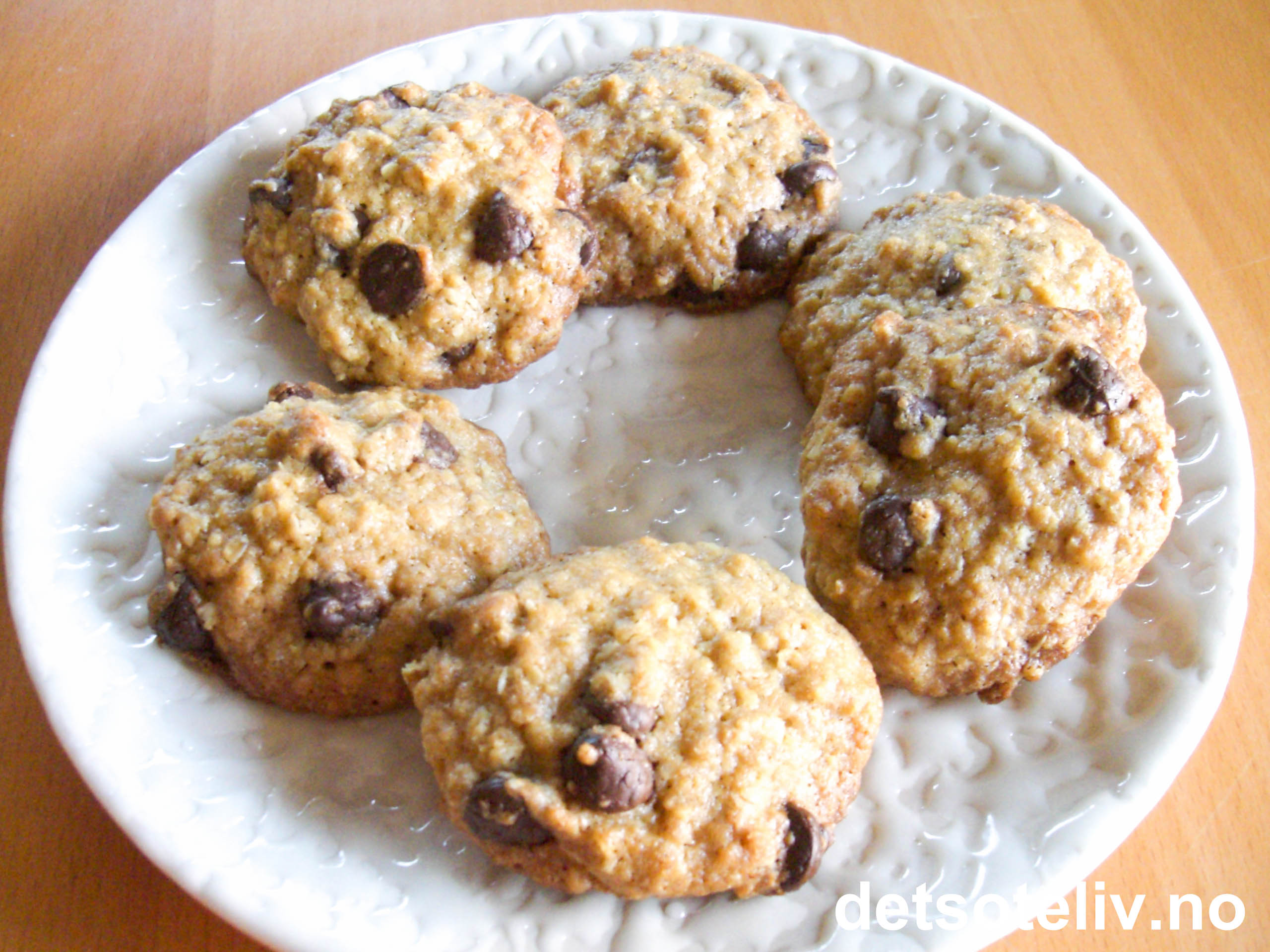 Originaloppskriften har amerikanske mål, som jeg har gjort om til norske mål. Dette kan medføre at deigen enten blir littegrann for fast eller littegrann for løs i konsistensen. Stek derfor en prøvekake for å sjekke om kakene flyter passe mye ut under steking. Hvis de flyter ut for mye, kan du tilsette mer hvetemel. Dersom de flyter ut for lite, kan du trykke kakene litt flate med fingrene før de stekes.
