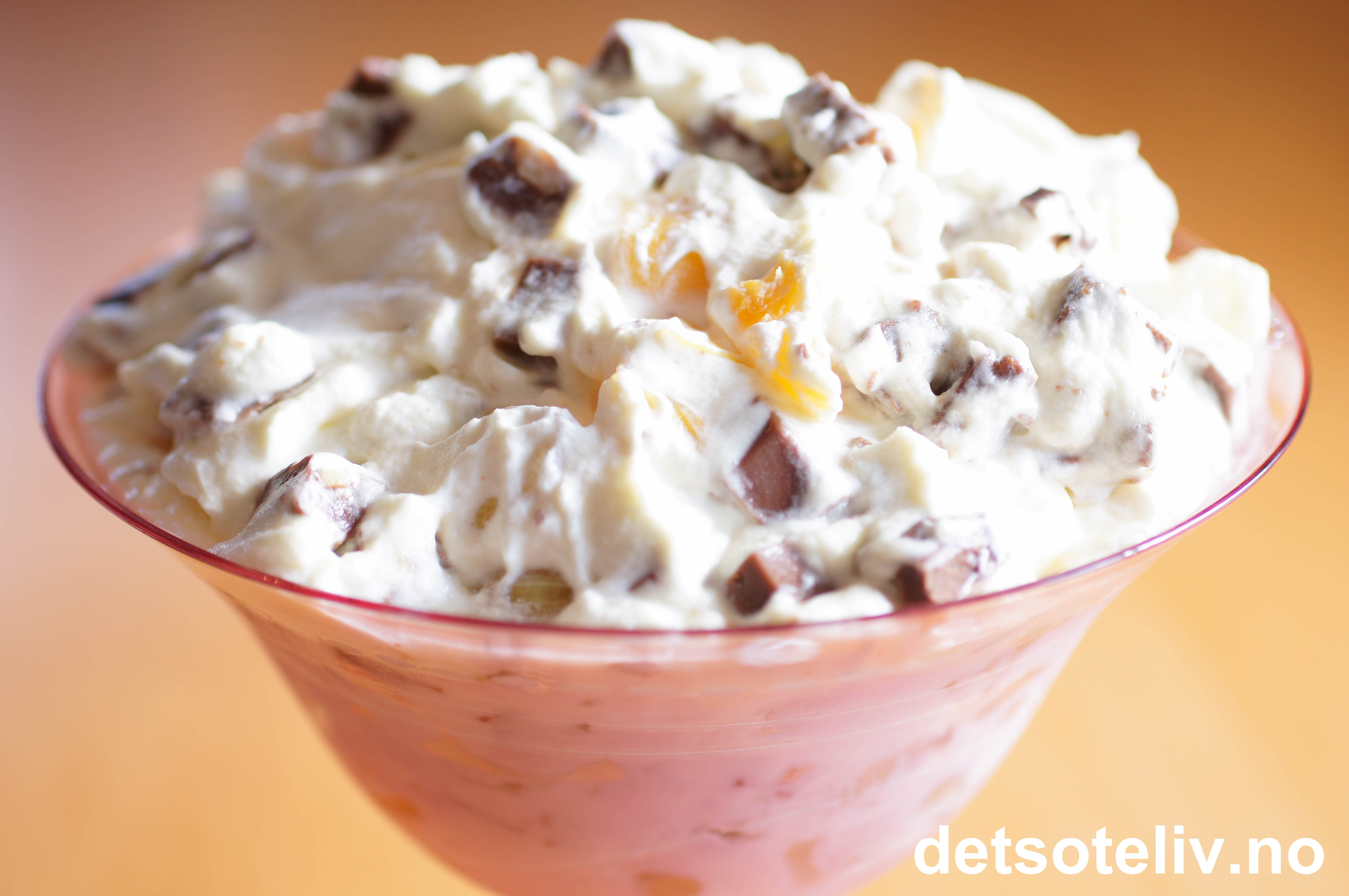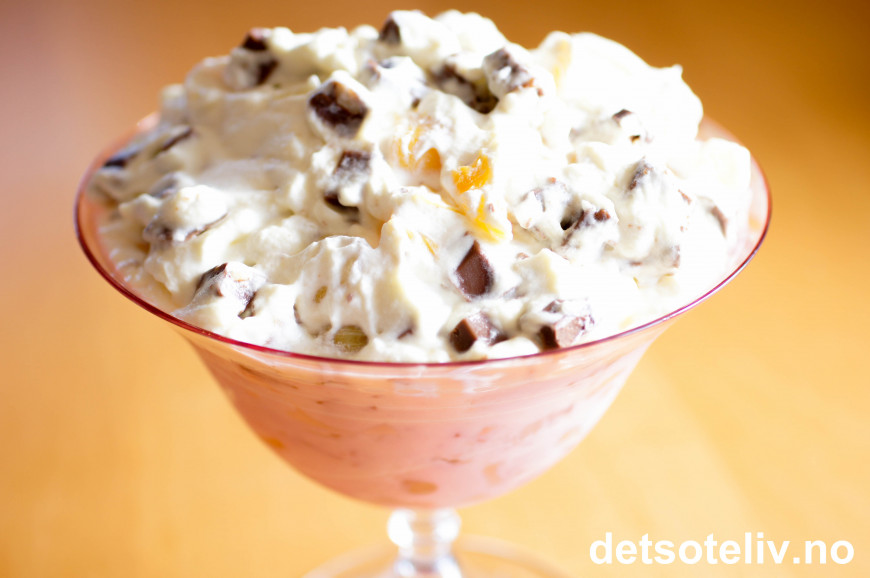 Husk å la fruktcocktailen renne godt av seg før du har den i kremen, ellers vil kremen bli alt for flytende i konsistensen. Den blir allerede litt løsere enn vanlig krem ved at du blander i melonyoghurten.