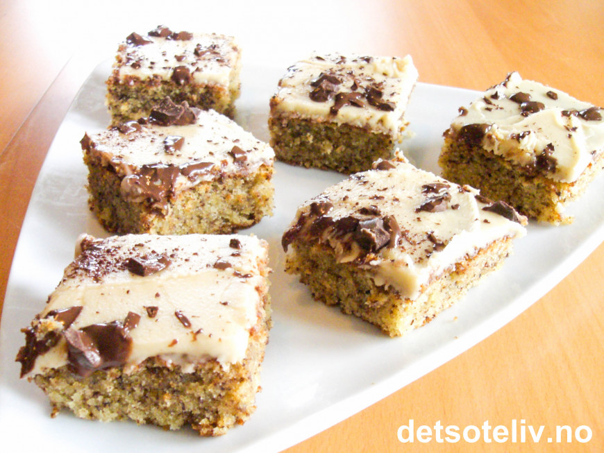Bre deigen utover i en stor, bakepapirkledd langpanne (ca 30x40 cm). Bruk en smørekniv til å få deigen jevnt utover. Stek kaken på nederste rille i ovnen ved 175°C i 30-35 min. Avkjøl kaken i formen. Hvelv kaken ut av formen og fjern bakepapiret.