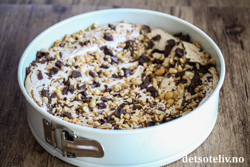 Jeg lagde en litt annen variant av kaken. Jeg hadde ferske jordbær sammen med kremen mellom de to bunnene (i tillegg til sjokoladekremen). Så droppet jeg peanøttene på toppen. Kaken ble vanvittig god og mottakelsen likeså. Fikk høre at det var «den beste kaken noensinne». Anbefales på det varmeste :)