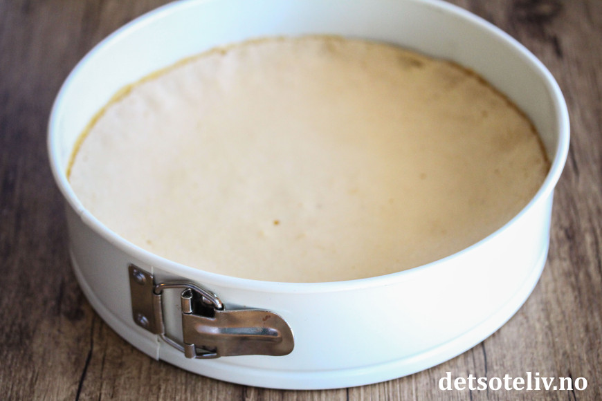 Ha deigen i en rund kakeform (26 cm i diameter). Det blir et tynt lag deig.