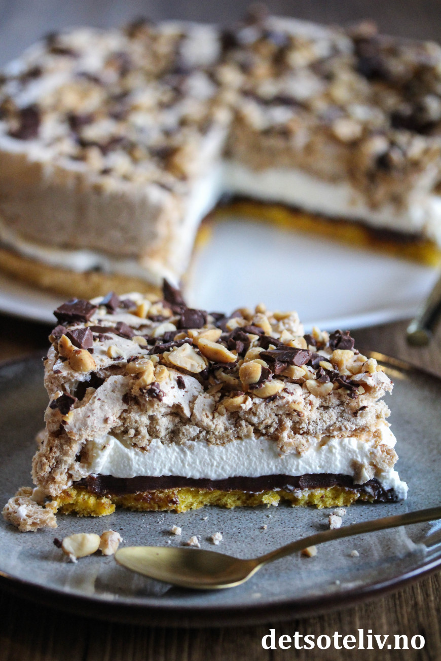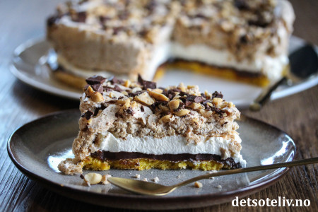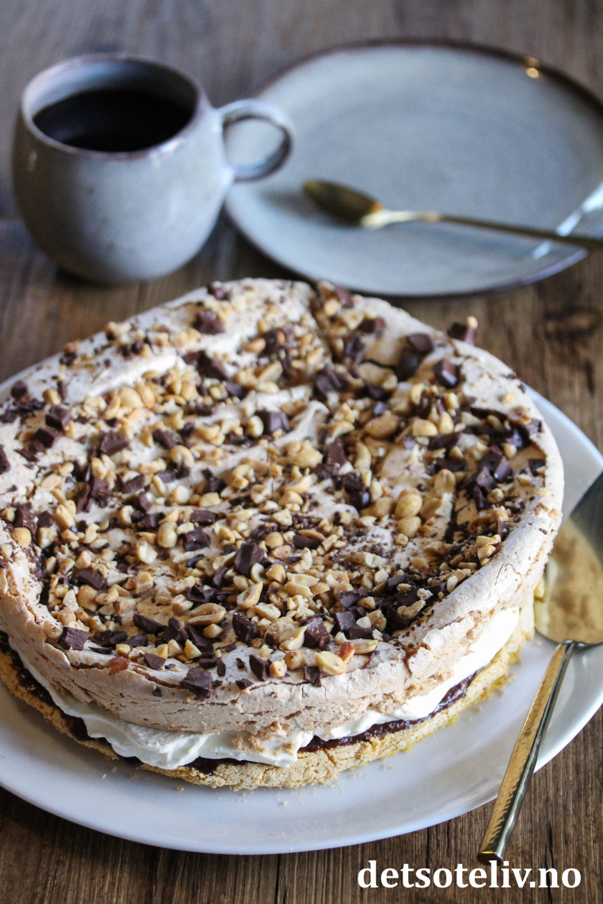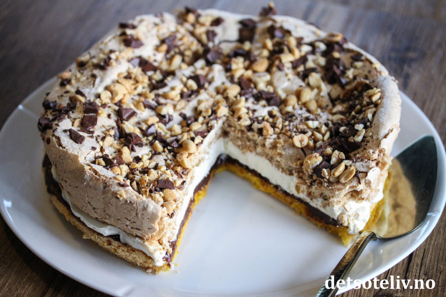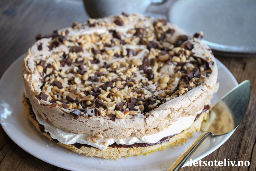Himmelsk marengskake består av en myk kakebunn som dekkes med en helt utrolig god sjokoladekrem. Oppå der har man et tykt lag luftig pisket krem. Den øverste kakebunnen består av en marengsbunn som er laget med brunt sukker. Peanøtter og hakket sjokolade til pynt passer perfekt til resten!