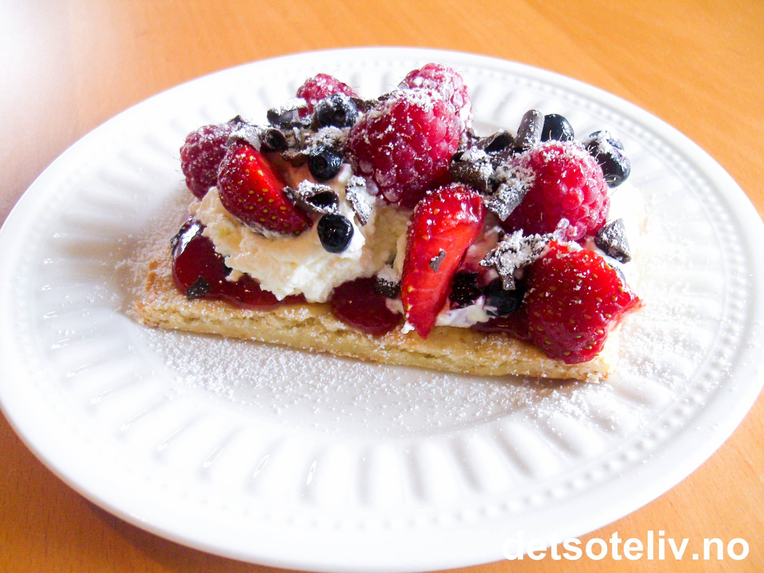 Del hver lengde i 6 stykker. Før servering has et stykke på serveringsasjetten. Smør over jordbærsyltetøy. Dekk med pisket krem, friske bær og dryss over høvlet sjokolade. Sikt eventuelt over litt melis til slutt. Server!