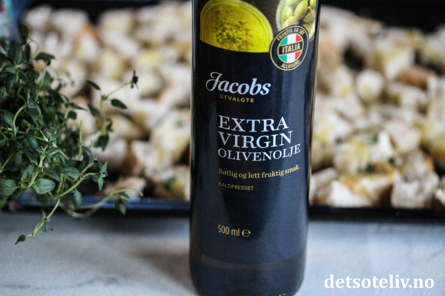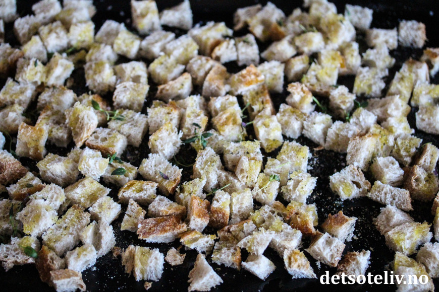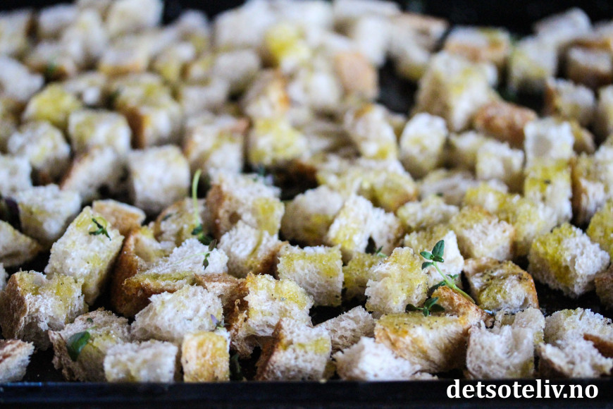 ♥ Jeg foretrekker å bruke olivenolje, men det går også veldig fint å dryppe smeltet smør over krutongene.