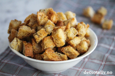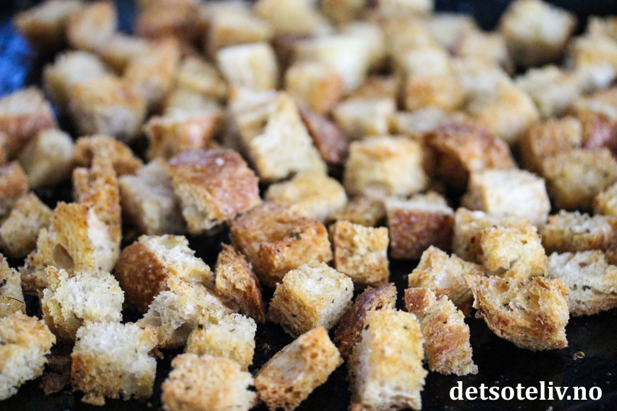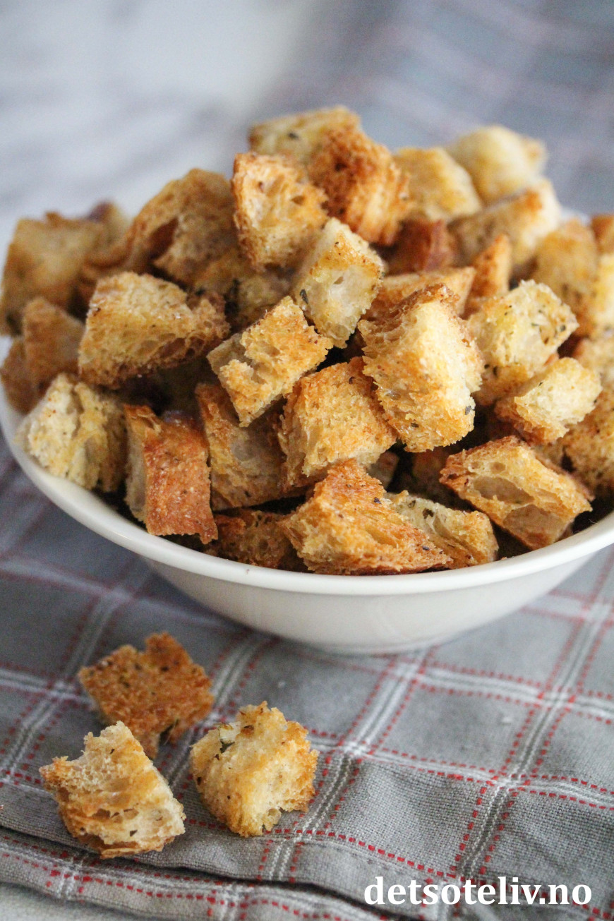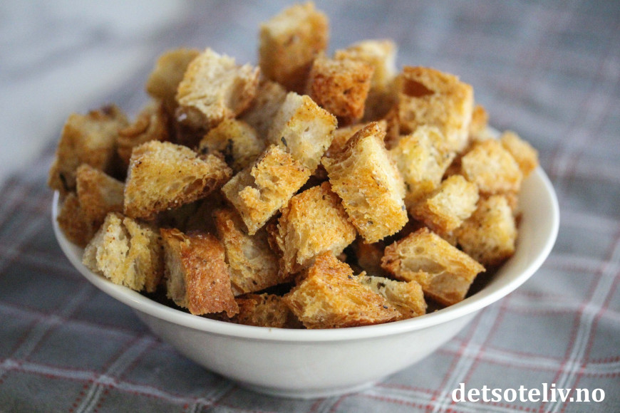 Brødkrutongene blir så gode og sprø at de til og med kan gomles på som snacks! 😃