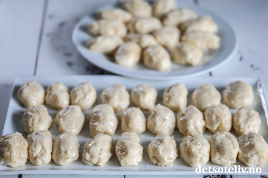 Form fiskemassen til spiseskjestore, litt avlange fiskeboller. Fiskemassen er klissete, så bruk en spiseskje som du dypper ofte i en bolle med kaldt vann, og sørg også for å ha fuktige hender som du skyller ofte i kaldt vann.