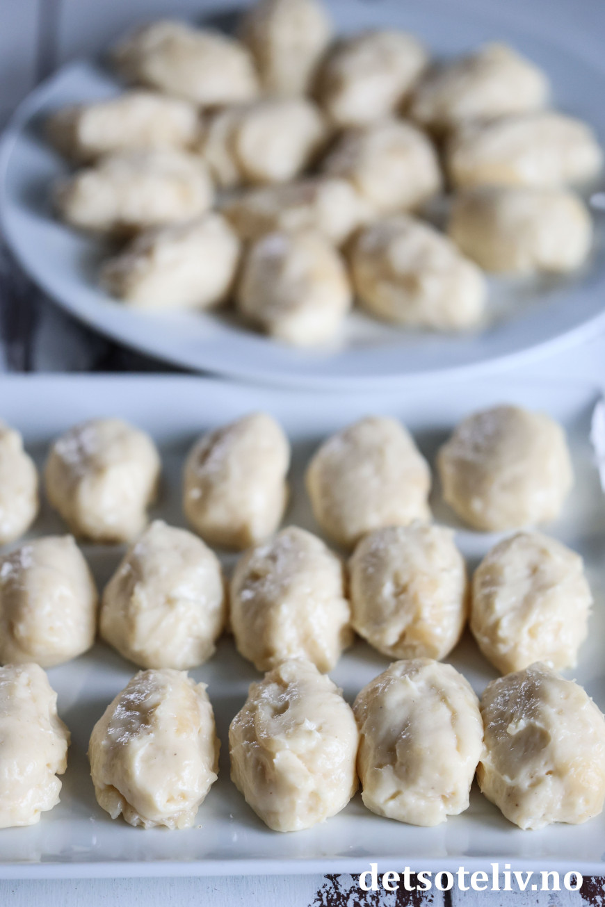 ♥ Ikke tilsett all fløtemelken på en gang, for da vil fiskemassen kunne skille seg. Tilsett litt av gangen, og kjør dette godt inn i fiskemassen før du tilsetter litt til. Tilpass dessuten mengden fløtemelk, for mengden man trenger vil kunne variere noe alt etter hvilken fisk du bruker, og hvorvidt du bruker fisk som har vært frossen (i så fall trengs det litt mindre fløtemelk). Fiskemassen må være tykk nok til at det går å forme den til fiskeboller. Mengdene i oppskriften er tilpasset at man bruker fersk hyse / kolje, som altså ikke har vært frosset.