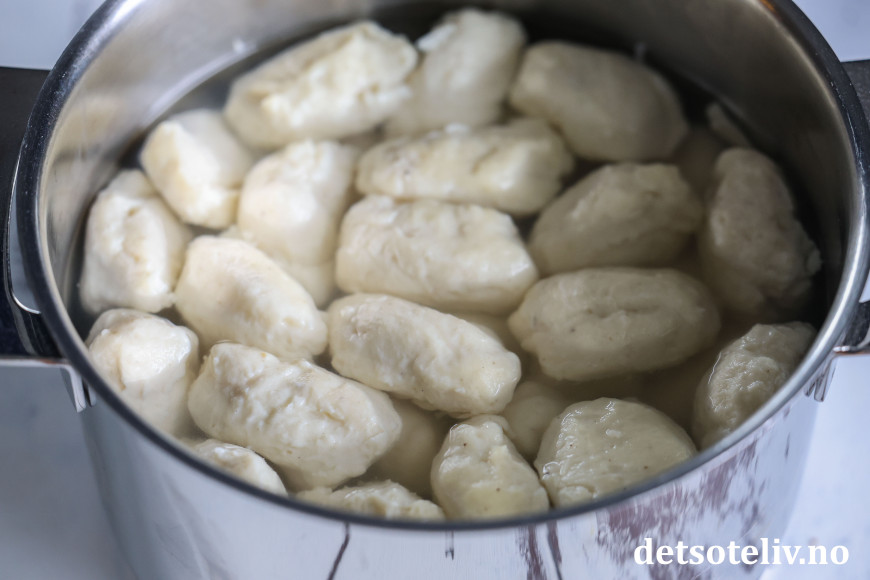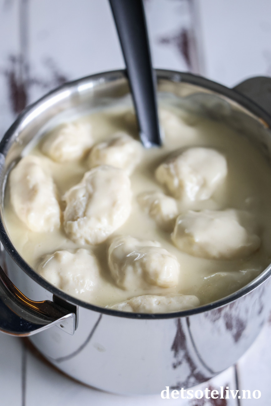 Fiskebollene formes og trekkes i varmt vann, før de legges i en deilig tykk og hjemmelaget hvit saus.