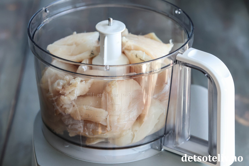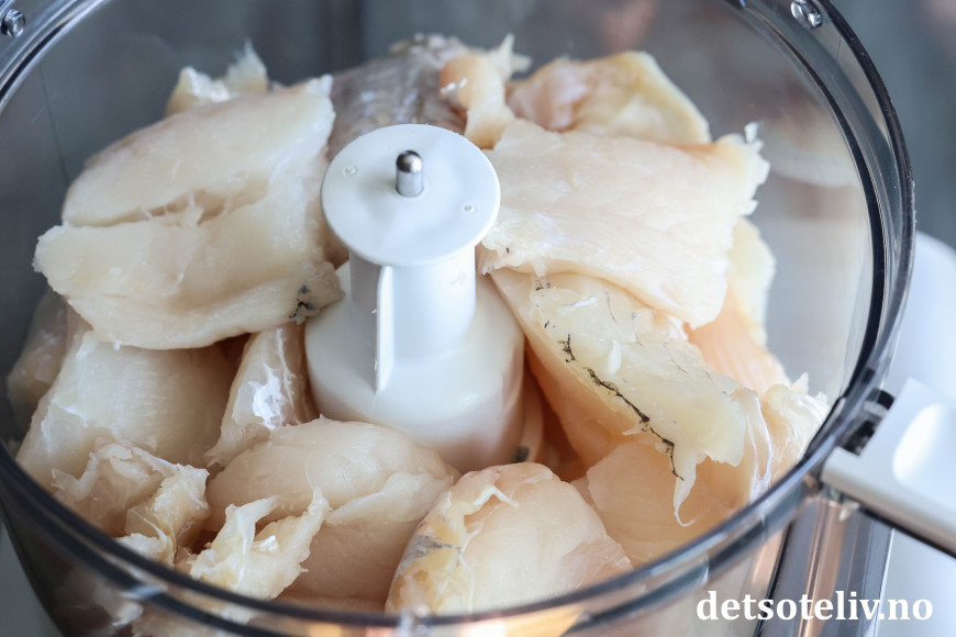 Skjær fiskefiletene i mindre biter (fjern all synlige spor av fiskeben). Ha fiskebitene i en food processor.