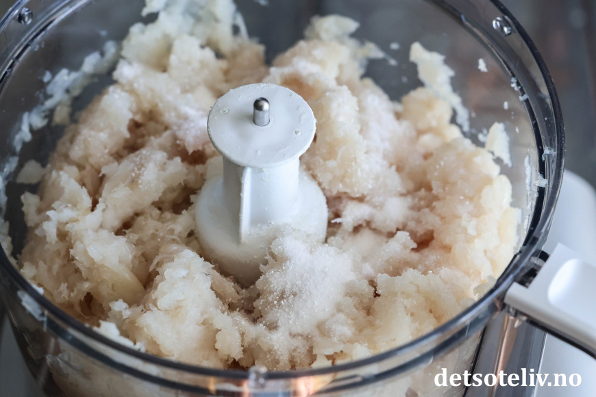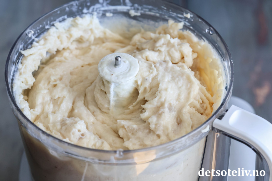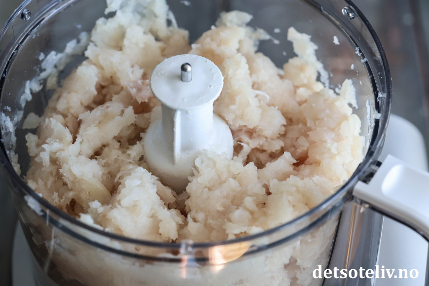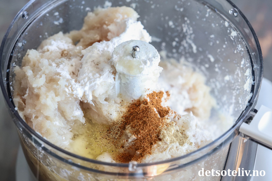 Bland potetmelet med malt muskat og hvit pepper. Ha dette i food processoren.