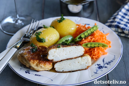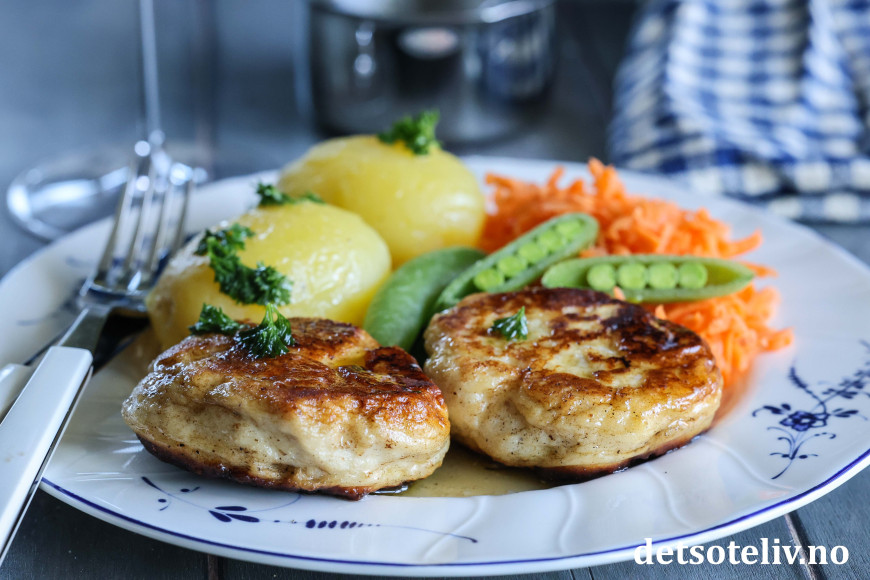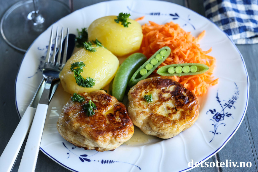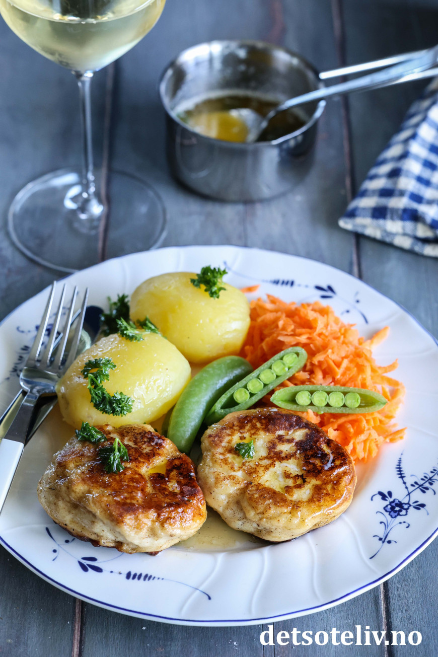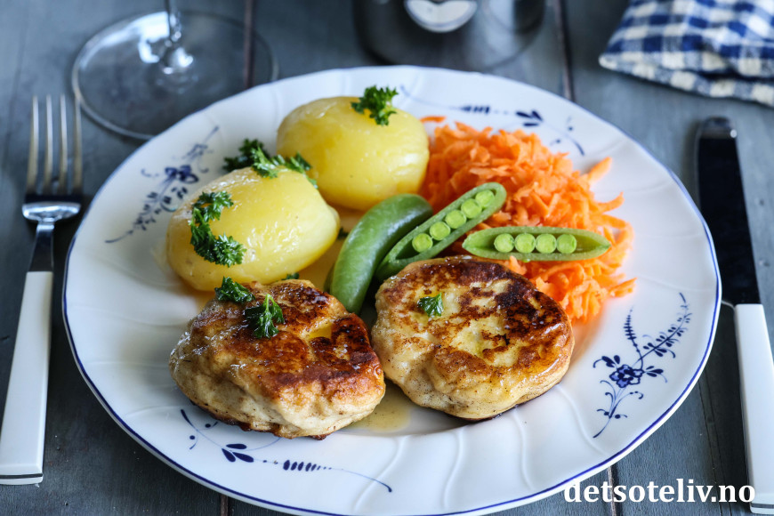Server fiskekakene nystekte sammen med kokte poteter, lett dampede sukkererter (og/eller andre grønnsaker), raspede gulrøtter og persillesmør.