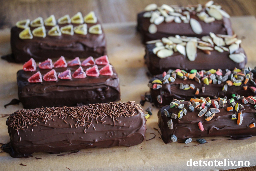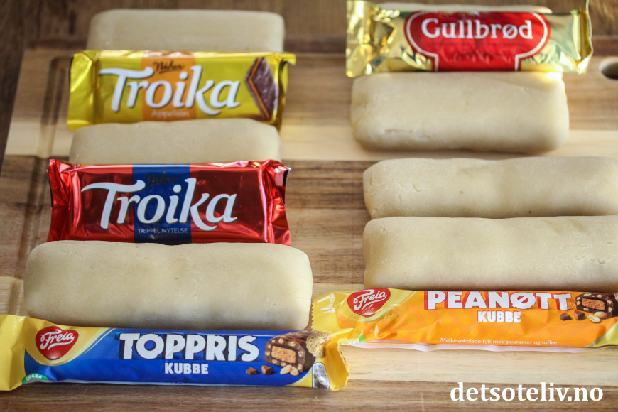Jeg har her laget varianter med Troika, Gullbrød, Toppris og Peanøttkubbe.