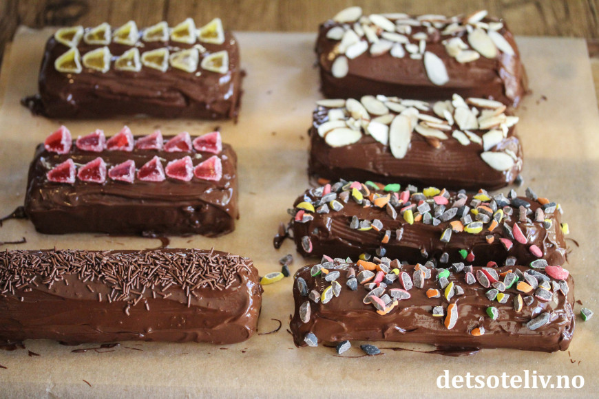 Snu brødene og smør resten av sjokoladen rundt marsipanbrødene, slik at de blir helt dekket. Pynt med gelétopper, mandelflak, strøssel - eller annen pynt du liker.