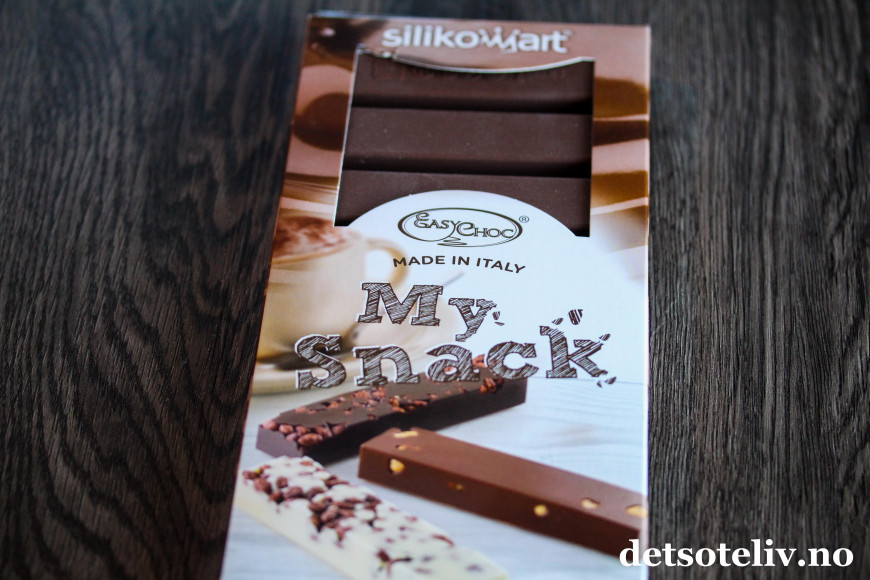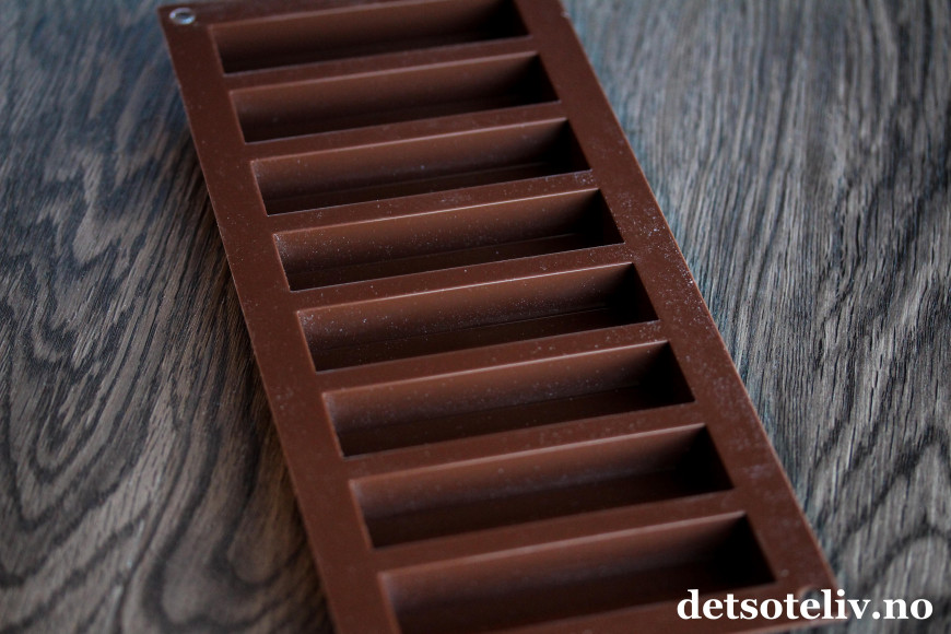 Jeg har brukt en kjempefin silikonform fra SilikoMart som gir avlange sjokoladebrød i passe stor "snack-størrelse".