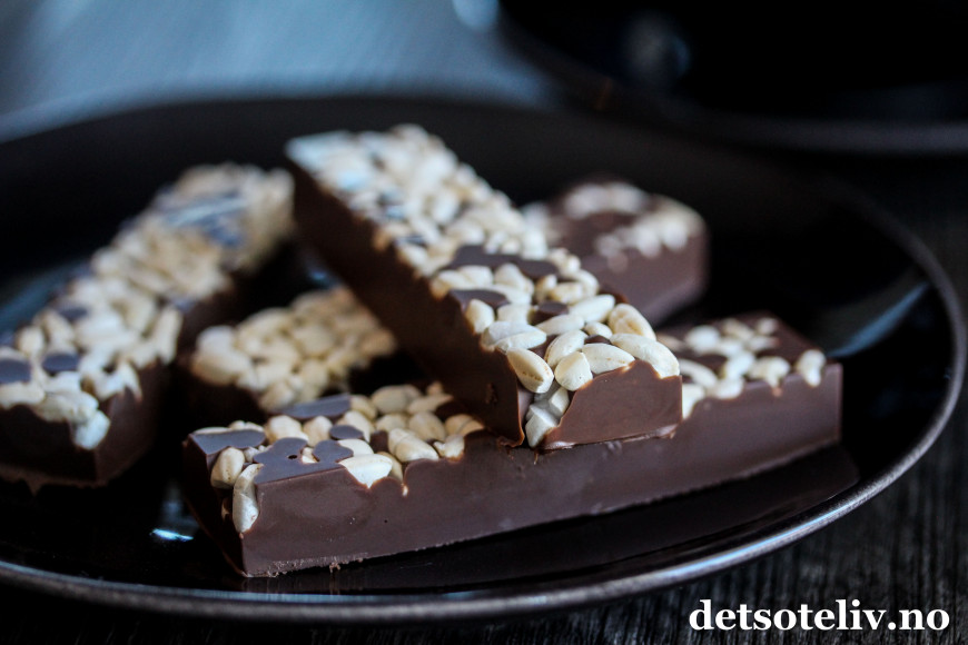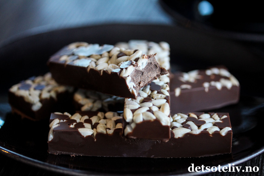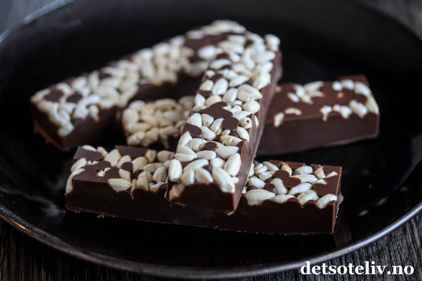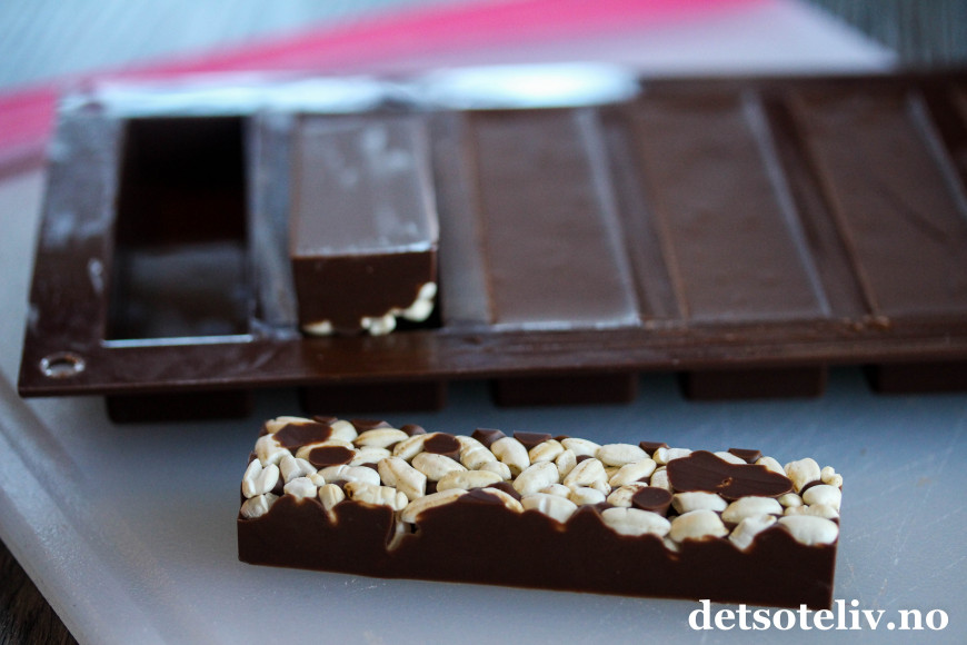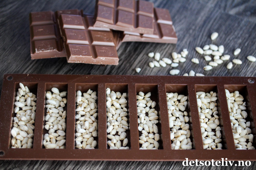 Sjokoladen kan fylles med det du liker, for eksempel rosiner, nøtter - eller puffet ris, som jeg har brukt her for å lage hjemmelagde risbrød. Disse er spesielt populære blant barna!