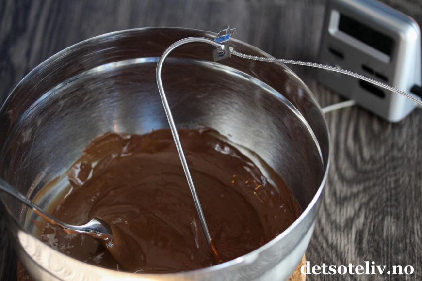 Temperering av sjokolade gjør at den tåler bedre å stå i romtemperatur. Det er ikke absolutt nødvendig, men gir et enda bedre resultat og er slett ikke vanskelig. I stedet for å ha all sjokoladen i bollen som står over vannbad, har du bare i melkesjokoladen. La den smelte og sjekk med et termometer at den når 45°C (bruker du bare mørk sjokolade, skal temperaturen være 50°C).