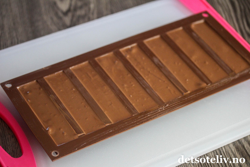 Fyll opp formene med smeltet sjokolade. Glatt gjerne til overflaten med en stor kniv eller stekespade. Sett formen i kjøleskapet til sjokoladen har stivnet, dette tar ikke mer enn 1- 2 timer.