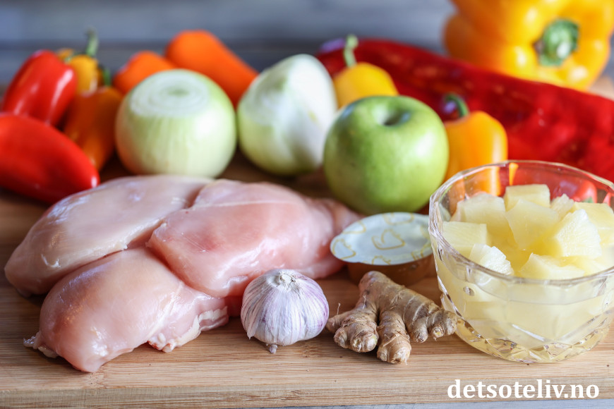 ♥ Merk at jeg tilsetter både ananasbiter og ananassaften i gryteretten. I stedet for hermetisk ananas kan du selvfølgelig gjerne bruke fersk ananas (bruk i så fall ca. en kvart ananas som er skjært i terninger).