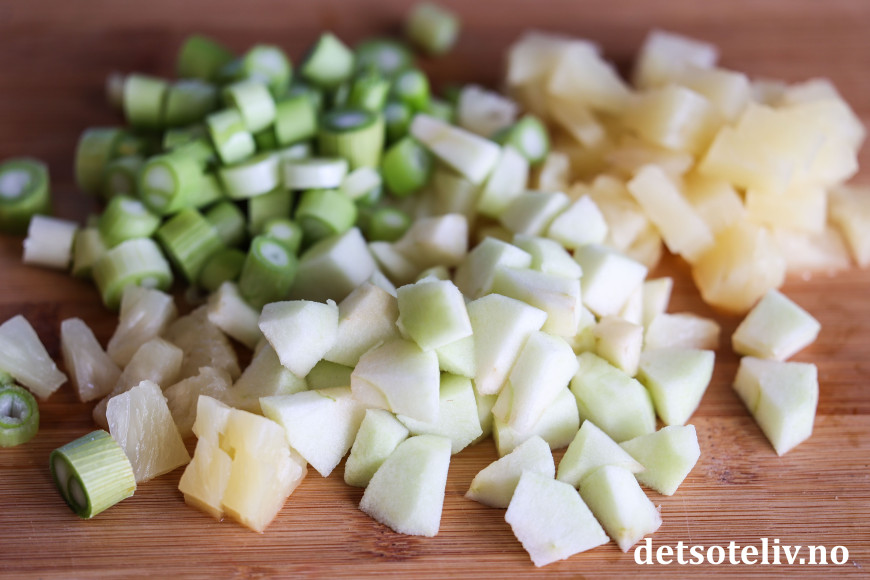 Skrell eplet og skjær det i terninger, vårløk i skiver, og ananasen i små biter (dersom det er hele ringer i boksen). Ha dette i kjelen sammen med ananassaften fra hermetikkboksen.