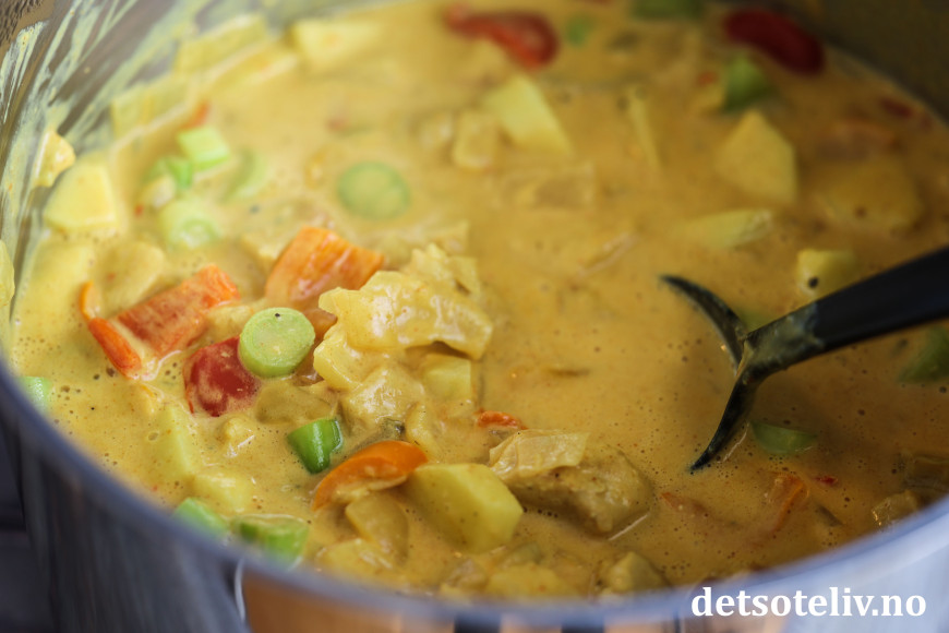 ♥ Du velger selv om du ønsker å bruke matfløte eller kremfløte. Jeg brukte 2 dl matfløte og 1 dl kremfløte, i tillegg til at jeg brukte kokosmelk som ikke er fettredusert. Dette gir en fyldig og kremete gryterett.