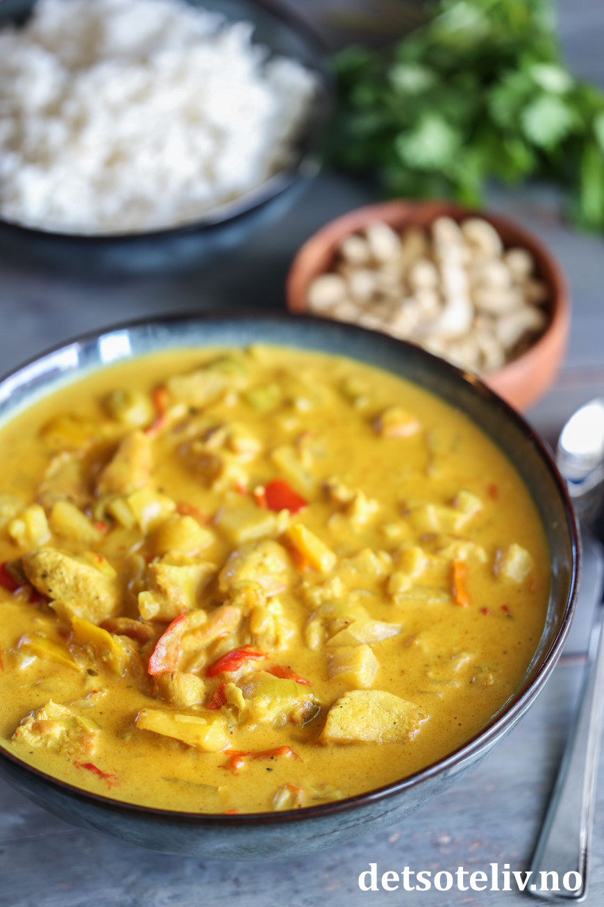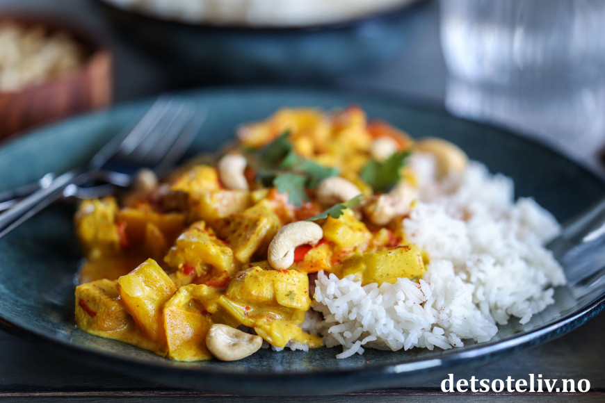 Serveres med ris og gjerne noen cashewnøtter og frisk koriander som tilbehør.