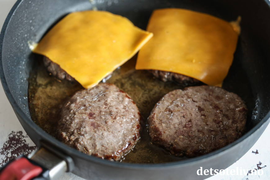 Stek burgerne i stekepanne med nøytral olje og en klatt smør. Legg osteskivene oppå burgerne på slutten av steketiden, slik at de smelter litt.