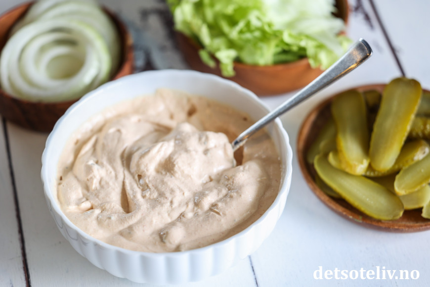 ♥ Porsjonen hamburgerdressing i denne oppskriften er større enn det du trenger til burgerne. Server dressingen som tilbehør. Kan oppbevares i kjøleskapet.