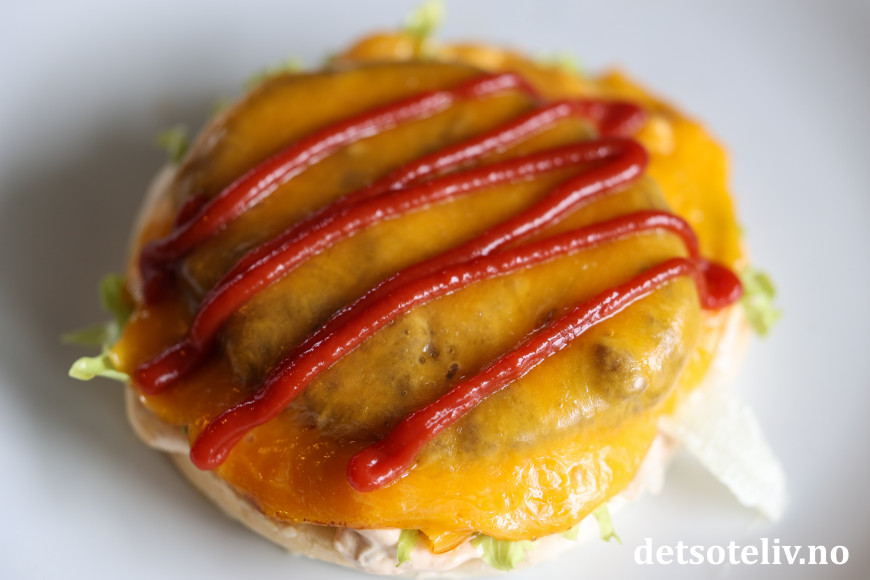 Topp med ketchup og legg på toppen av hamburgerbrødet.