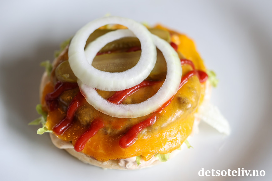 Gjenta med dressing, isbergsalat, løkringer og ny hamburger med ost på.