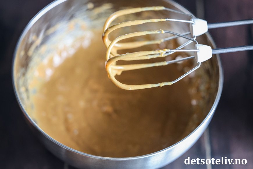 Ha innholdet i boksen i en skål og visp kremen jevn og glatt. La skålen stå i kjøleskapet over natten dersom du ønsker at karamellkremen skal få en tykkere konsistens.