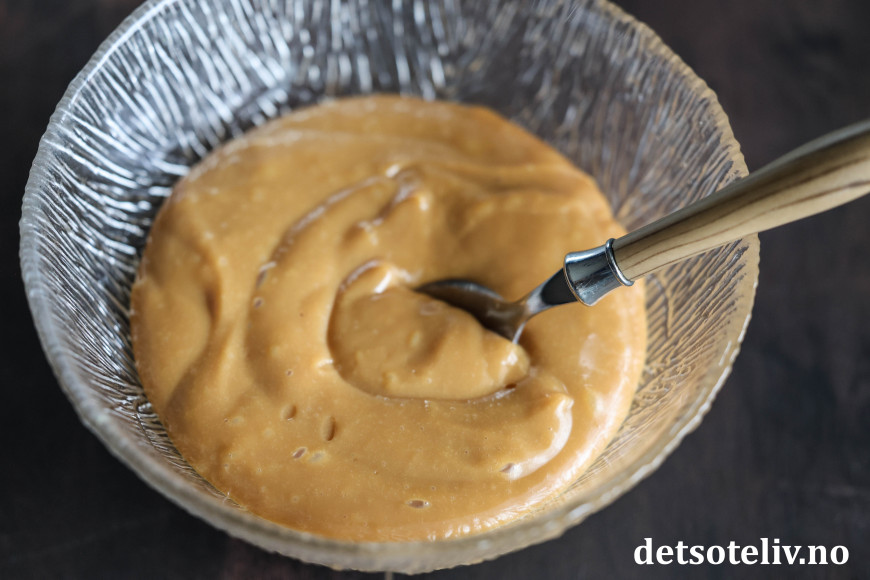 La skålen stå i kjøleskapet over natten dersom du ønsker at karamellkremen skal få en tykkere konsistens.