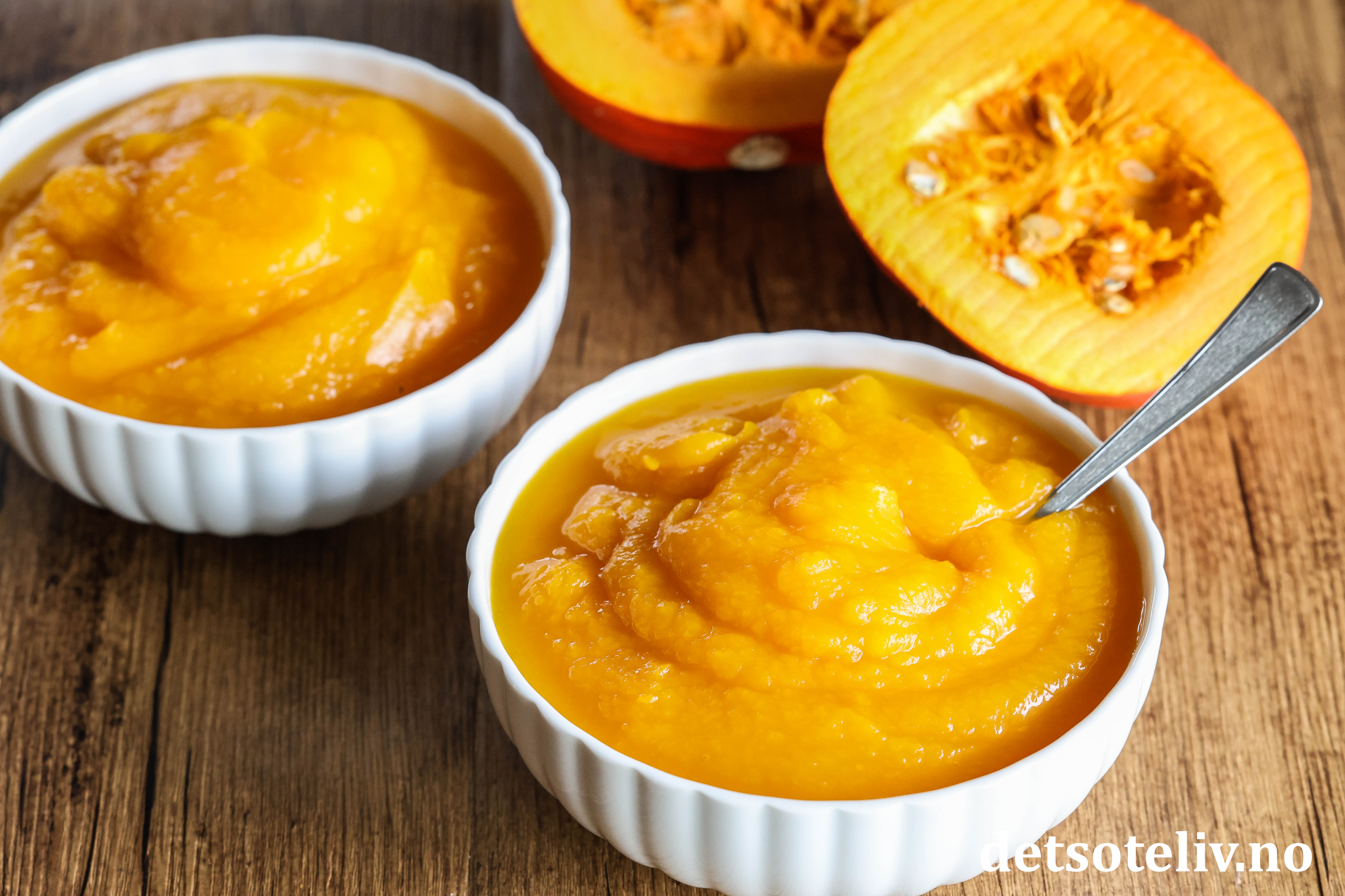 Ferdiglaget gresskarmos kan oppbevares i kjøleskapet og brukes til mange ulike oppskrifter. Se for eksempel disse HER.
