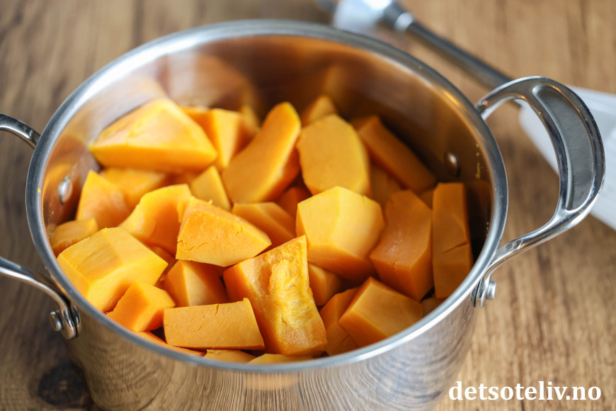 Skjær gresskarkjøttet i biter og ha dem i en kjele. Ha litt vann i kjelen og sett lokk på kjelen.