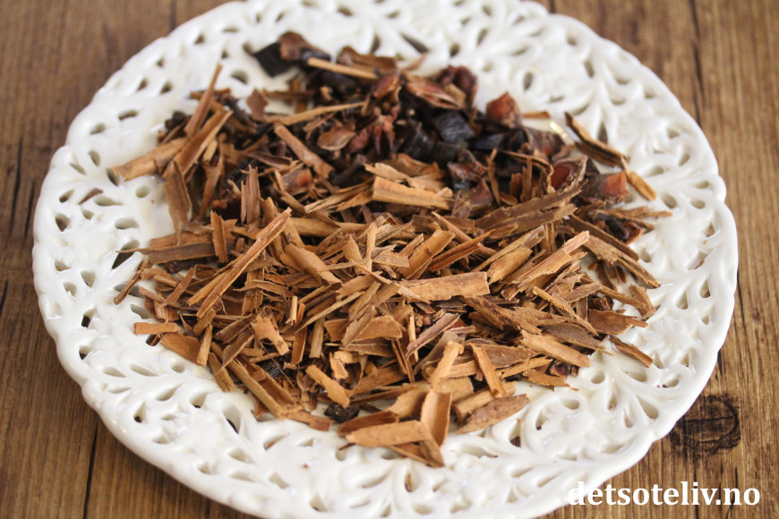 Klipp eller hakk det tørkede appelsinskallet, mandarinskivene og epleskivene i små biter. Spar gjerne noen tørkede klementinskiver som du kan bruke i tekoppen etterpå.